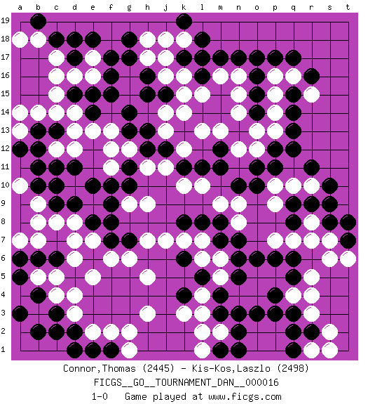 Last move : 1-0 2010 January 8 11:34:1 [Event "FICGS__GO__TOURNAMENT_DAN__000016"] [Site "FICGS"] [Date "2009.03.31"] [Round "1"] [Black "Connor,Thomas"] [White "Kis-Kos,Laszlo"] [Result "1-0"] [Rating 1 "2445"] [Rating 2 "2498"] 1.r16 d4 2.q3 d16 3.p17 r5 4.r9 o4 5.q5 q4 6.p4 r4 7.p3 p5 8.q6 r3 9.o3 o5 10.m3 s7 11.q8 m5 12.k4 n8 13.c6 h3 14.k6 c8 15.e6 h5 16.d9 d8 17.e8 e9 18.c9 b9 19.b10 b8 20.c10 e7 21.f8 d6 22.f7 d7 23.e10 e5 24.f17 h17 25.f15 d14 26.k17 k16 27.l16 j16 28.l17 f13 29.g14 j14 30.g13 f11 31.f10 g12 32.e14 e13 33.d15 c15 34.e15 c14 35.h13 k12 36.d17 c16 37.c18 e16 38.f16 e17 39.e18 c17 40.g18 h18 41.d18 b18 42.k13 j13 43.h12 h11 44.j12 j11 45.h15 k14 46.h16 j17 47.g17 l13 48.q12 l3 49.m4 l4 50.l5 k3 51.n5 m6 52.n6 n4 53.n3 l6 54.o6 h7 55.c3 c4 56.b4 d3 57.c2 b5 58.a3 p15 59.q14 n15 60.o16 p13 61.p12 g9 62.f9 n12 63.d11 o12 64.q13 p14 65.m7 l7 66.l8 k7 67.k8 j7 68.m8 k18 69.l18 n9 70.n7 l10 71.s8 r7 72.r2 s2 73.q2 s1 74.t7 s6 75.b19 a18 76.b13 b14 77.c13 d13 78.d2 e2 79.b2 c12 80.b12 d12 81.c11 f6 82.e1 f2 83.f1 g1 84.d1 g2 85.b6 c5 86.a5 a7 87.a6 q16 88.q17 r15 89.q15 p16 90.o17 r8 91.s9 m2 92.n2 l2 93.k19 j18 94.o15 n14 95.o10 p7 96.p6 p9 97.p11 q10 98.r11 r1 99.q1 r10 100.s10 l15 101.n10 m9 102.g7 g6 103.q9 p10 104.o11 n16 105.n17 m16 106.m17 a13 107.a12 a14 108.m11 a10 109.b11 q7 110.m12 m13 111.o14 o13 112.g10 t6 113.t8 h9 114.g11 f12 115.m1 l1 116.n1 b7 117.j15 k15 118.l11 k10 119.k11 1-0 Here are the names of the openings (joseki) played in the four corners : Corner q4 : q3 r5 Komoku (Somok, Xiao~mu`) 3-4 Point. The komoku (3-4) point is the traditional corner enclosure move.. Ikken Kakari (Hankan Keolch'im, Yi Gua`jiao~, 1-Space Low Pincer). The small knight move is the basic approach move to the 3-4 point stone. It has been continually used for over four centuries. There are limitless variations, with new moves constantly being discovered. White 2 opens the door to a treaure store of joseki. Corner d4 : d4 c6 Hoshi (Hwajeom, Seongjeom, Xingwei`) 4-4 Point. The star or hoshi (4-4) point, emphasizing influence at the potential expense of territory. Ikken Kakari (Hankan Keolch'im, Yi Gua`jiao~, 1-Space Low Approach). Black 2 is the standard approach move to the 4-4. Corner d16 : d16 f17 Hoshi (Hwajeom, Seongjeom, Xingwei`) 4-4 Point. The star or hoshi (4-4) point, emphasizing influence at the potential expense of territory. Ikken Kakari (Hankan Keolch'im, Yi Gua`jiao~, 1-Space Low Approach). Black 2 is the standard approach move to the 4-4. Player Black won this Go (weiqi, baduk) game. Follow this game move after move (download)Strike at the waist of the knight's move. (Anonymous) Logic : The art of thinking and reasoning in strict accordance with the limitations and incapacities of the human misunderstanding. (Ambrose Bierce)
