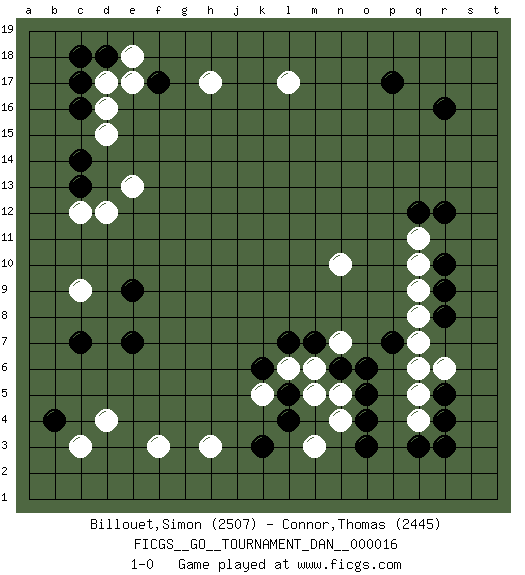 Last move : 1-0 2009 May 26 22:37:29 [Event "FICGS__GO__TOURNAMENT_DAN__000016"] [Site "FICGS"] [Date "2009.03.31"] [Round "1"] [Black "Billouet,Simon"] [White "Connor,Thomas"] [Result "1-0"] [Rating 1 "2507"] [Rating 2 "2445"] 1.r16 d16 2.q3 d4 3.f17 h17 4.p17 q5 5.r5 r6 6.r4 q6 7.o3 q10 8.c17 d17 9.c16 d15 10.d18 e18 11.c18 e17 12.c14 l17 13.r12 f3 14.b4 c3 15.c7 c9 16.e7 c12 17.c13 d12 18.e9 e13 19.r8 q4 20.r3 q8 21.r9 q9 22.r10 q11 23.p7 q7 24.q12 m3 25.o5 n10 26.k3 n4 27.o4 h3 28.l4 n5 29.n6 m5 30.l7 l6 31.k6 k5 32.l5 m6 33.m7 n7 34.o6 1-0 Here are the names of the openings (joseki) played in the four corners : Corner d16 : d16 f17 Hoshi (Hwajeom, Seongjeom, Xingwei`) 4-4 Point. The star or hoshi (4-4) point, emphasizing influence at the potential expense of territory. Ikken Kakari (Hankan Keolch'im, Yi Gua`jiao~, 1-Space Low Approach). Black 2 is the standard approach move to the 4-4. Corner q4 : q3 q5 Komoku (Somok, Xiao~mu`) 3-4 Point. The komoku (3-4) point is the traditional corner enclosure move.. Ikken Takagakari (Hankan Nop'dakeolch'im, Yi Gaogua`jiao~, 1-Space High Approach). The 5-4 approach move has become more popular in modern times, as modern Go emphasizes speed and influence. Player Black won this Go (weiqi, baduk) game. Follow this game move after move (download)Territory is a closed space where time no longer exists. The transformation around it slower alter it, and sometimes it cracks open like a rotten egg at the least shock. (Pierre Audouard) I don't know, I don't care, and it doesn't make any difference. (Albert Einstein)