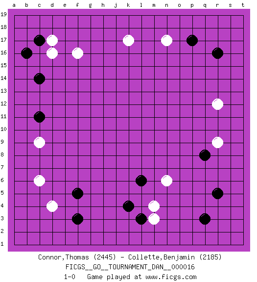 Last move : 1-0 2009 June 23 20:39:35 [Event "FICGS__GO__TOURNAMENT_DAN__000016"] [Site "FICGS"] [Date "2009.03.31"] [Round "1"] [Black "Connor,Thomas"] [White "Collette,Benjamin"] [Result "1-0"] [Rating 1 "2445"] [Rating 2 "2185"] 1.r16 d4 2.q3 d16 3.p17 r9 4.r5 r12 5.f3 c6 6.k4 k17 7.c14 f16 8.c11 c9 9.b16 n17 10.c17 d17 11.f5 m3 12.l3 m4 13.l6 n6 14.q8 1-0 This go game has been lost on time (started : 2009.03.31 9:29:52) Here are the names of the openings (joseki) played in the four corners : Corner q4 : q3 r9 Komoku (Somok, Xiao~mu`) 3-4 Point. The komoku (3-4) point is the traditional corner enclosure move.. Corner d4 : d4 f3 Hoshi (Hwajeom, Seongjeom, Xingwei`) 4-4 Point. The star or hoshi (4-4) point, emphasizing influence at the potential expense of territory. Ikken Kakari (Hankan Keolch'im, Yi Gua`jiao~, 1-Space Low Approach). Black 2 is the standard approach move to the 4-4. Corner d16 : d16 c14 Hoshi (Hwajeom, Seongjeom, Xingwei`) 4-4 Point. The star or hoshi (4-4) point, emphasizing influence at the potential expense of territory. Ikken Kakari (Hankan Keolch'im, Yi Gua`jiao~, 1-Space Low Approach). Black 2 is the standard approach move to the 4-4. Player Black won this Go (weiqi, baduk) game. Follow this game move after move (download)Go is to western chess what philosophy is to double entry accounting. (from Shibumi, by Trevanian) A proverb is a short sentence based on long experience. (Miguel de Cervantes)