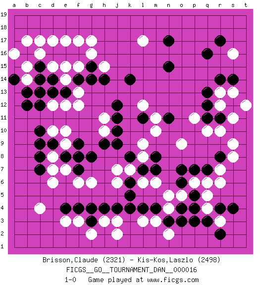 Last move : 1-0 2009 July 27 3:59:49 [Event "FICGS__GO__TOURNAMENT_DAN__000016"] [Site "FICGS"] [Date "2009.03.31"] [Round "1"] [Black "Brisson,Claude"] [White "Kis-Kos,Laszlo"] [Result "1-0"] [Rating 1 "2321"] [Rating 2 "2498"] 1.q16 c4 2.p3 e3 3.c15 d17 4.e16 e17 5.f16 g17 6.c10 g16 7.g15 h15 8.g14 f17 9.n17 d15 10.d16 c16 11.d14 b15 12.c14 b14 13.b16 c17 14.b13 b17 15.a14 a16 16.r4 r10 17.k4 c13 18.b12 e14 19.d13 f15 20.e13 r13 21.r8 s16 22.r17 l17 23.n15 r6 24.q7 q6 25.o7 p6 26.p7 q4 27.q3 n5 28.m4 m6 29.m8 o9 30.m7 l6 31.q11 q10 32.r11 p11 33.q13 s11 34.s12 r12 35.q12 s9 36.r14 s13 37.s14 t12 38.o4 s8 39.c7 m10 40.k8 j6 41.g3 g6 42.j9 j3 43.j4 h3 44.h4 g2 45.g4 j2 46.e4 f3 47.f4 l3 48.l4 n4 49.n3 m3 50.o6 o5 51.p5 n2 52.o3 d6 53.k6 k7 54.k5 j7 55.l7 q5 56.p4 r3 57.s4 r7 58.r2 d7 59.c8 e9 60.e8 d8 61.d9 d10 62.c9 e10 63.g8 f8 64.f7 f6 65.f9 f13 66.f14 e15 67.h14 f12 68.j12 d12 69.c12 e12 70.c13 h11 71.j11 h10 72.h9 e7 73.f8 l9 74.j10 l8 75.n11 l12 76.l11 m11 77.k14 1-0 Here are the names of the openings (joseki) played in the four corners : Corner d16 : c15 d17 Mokuhazushi (Waemok, Wai`mu`) 5-3 Point. The mokuhazushi (5-3) point was popular in the Edo period in Japan (1600 - 1867). It emphasizes influence; territorially, it is inferior to the 3-4 point. Komoku Kakari. White 2 is the standard approach because of its solidity and stability. Player Black won this Go (weiqi, baduk) game. Follow this game move after move (download)Always remember, keep the balance. [between territory and influence] (Figaro) A married woman is like a fish riding a bicycle. (Rodolfo d'Ettorre)