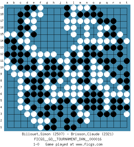 Last move : 1-0 2009 June 4 10:43:8 [Event "FICGS__GO__TOURNAMENT_DAN__000016"] [Site "FICGS"] [Date "2009.03.31"] [Round "1"] [Black "Billouet,Simon"] [White "Brisson,Claude"] [Result "1-0"] [Rating 1 "2507"] [Rating 2 "2321"] 1.r16 c4 2.q3 e17 3.c16 d15 4.c15 d14 5.c13 k16 6.e4 e3 7.f3 d3 8.g4 c6 9.l3 p16 10.p17 o17 11.q17 o14 12.o18 n17 13.n18 m17 14.r13 q5 15.r5 r6 16.r4 q6 17.p4 r10 18.c17 c14 19.b14 d13 20.c12 d11 21.d12 e12 22.d16 e16 23.e11 f12 24.d10 f11 25.e10 l5 26.j4 m3 27.m2 l2 28.k2 n2 29.l1 n3 30.n5 m4 31.p3 o5 32.o4 o6 33.n4 m7 34.l6 m6 35.m5 k6 36.l4 l7 37.q11 p10 38.q10 q9 39.r11 p9 40.o12 o11 41.o13 q14 42.q13 r14 43.s14 s15 44.r15 p14 45.s12 m13 46.n12 m12 47.n11 m10 48.n10 h5 49.g9 f10 50.f9 e9 51.e8 d9 52.c10 c9 53.f6 b10 54.c11 d7 55.h10 j11 56.h11 h12 57.j10 k11 58.d18 e18 59.m18 l18 60.r9 r8 61.s10 h7 62.e7 g7 63.f7 h3 64.h4 f2 65.g3 g2 66.h2 m19 67.b11 b9 68.s5 q16 69.r17 g5 70.f5 k9 71.s8 s7 72.e19 f19 73.d19 f18 74.m11 m9 75.l11 k12 76.l12 l13 77.n9 o8 78.n8 k10 79.g1 f1 80.h1 e2 81.t8 n7 82.d5 c5 83.d8 c8 84.d6 c7 85.q15 p15 86.n13 n14 87.g11 g12 88.p5 g8 89.f8 h9 90.j9 j8 91.h8 n19 92.o19 l19 93.p18 h9 94.g10 s6 95.p6 p7 96.j5 j6 97.g6 h6 98.m8 l8 99.l10 l9 100.p11 o10 101.k5 t5 102.t4 t6 103.n6 q4 104.r3 d17 105.c18 p13 106.p12 a11 107.a12 a10 108.o7 o6 109.h8 d4 110.h9 l6 111.t7 q7 112.o5 o9 113.o7 t14 114.s13 o6 115.l17 k17 116.o7 a13 117.b12 o6 118.l16 l15 119.o7 b15 120.a14 o6 121.m16 n16 122.o7 a15 123.b13 o6 124.m15 n15 125.o7 e5 126.e6 o6 127.k18 m14 128.o7 s9 129.t9 o6 130.l17 l16 131.o7 t3 132.s4 o6 133.k19 l17 134.o7 j2 135.j3 o6 136.e15 e13 137.o7 j1 138.k1 o6 139.j7 k7 140.o7 t10 141.t11 o6 142.q8 p8 143.o7 pass 144.o6 pass 145.pass 1-0 Here are the names of the openings (joseki) played in the four corners : Corner d16 : e17 c16 Mokuhazushi (Waemok, Wai`mu`) 5-3 Point. The mokuhazushi (5-3) point was popular in the Edo period in Japan (1600 - 1867). It emphasizes influence; territorially, it is inferior to the 3-4 point. Komoku Kakari. Black 2 is the standard approach because of its solidity and stability. Corner d4 : c4 e4 Komoku (Somok, Xiao~mu`) 3-4 Point. The komoku (3-4) point is the traditional corner enclosure move.. Ikken Takagakari (Hankan Nop'dakeolch'im, Yi Gaogua`jiao~, 1-Space High Approach). The 5-4 approach move has become more popular in modern times, as modern Go emphasizes speed and influence. Corner q16 : r16 p16 Komoku (Somok, Xiao~mu`) 3-4 Point. The komoku (3-4) point is the traditional corner enclosure move.. Ikken Takagakari (Hankan Nop'dakeolch'im, Yi Gaogua`jiao~, 1-Space High Approach). The 5-4 approach move has become more popular in modern times, as modern Go emphasizes speed and influence. Player Black won this Go (weiqi, baduk) game. Follow this game move after move (download)Beginner's games are surprising, often incoherent and incomprehensible. When you improve, your game gains in consistency but flirts with stupidity: you become satisfied with truisms and mechanical movements, you try to obtain a feeling for clearness and style the easy way. (Pierre Audouard) They say poker is a zero-sum game. It must be, because every time I play my sum ends up zero. (Max Shapiro)