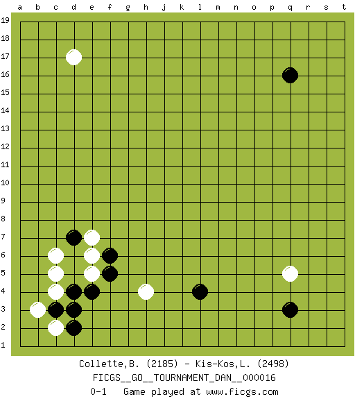 Last move : 0-1 2009 June 2 7:0:42 [Event "FICGS__GO__TOURNAMENT_DAN__000016"] [Site "FICGS"] [Date "2009.03.31"] [Round "1"] [Black "Collette,Benjamin"] [White "Kis-Kos,Laszlo"] [Result "0-1"] [Rating 1 "2185"] [Rating 2 "2498"] 1.q16 c4 2.q3 d17 3.e4 h4 4.d7 e5 5.f5 e6 6.d4 c6 7.f6 c5 8.c3 b3 9.d2 c2 10.d3 e7 11.l4 q5 0-1 This go game has been lost on time (started : 2009.03.31 9:29:52) Here are the names of the openings (joseki) played in the four corners : Corner d4 : c4 e4 Komoku (Somok, Xiao~mu`) 3-4 Point. The komoku (3-4) point is the traditional corner enclosure move.. Ikken Takagakari (Hankan Nop'dakeolch'im, Yi Gaogua`jiao~, 1-Space High Approach). The 5-4 approach move has become more popular in modern times, as modern Go emphasizes speed and influence. Player White won this Go (weiqi, baduk) game. Follow this game move after move (download)Corner, side, centre. (Anonymous) Everything in life is luck. (Donald Trump)