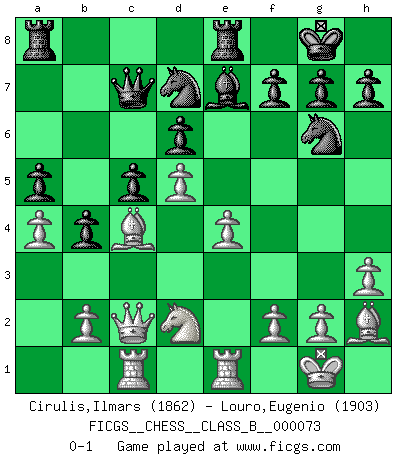 Last move : 0-1 2009 October 15 21:7:38 [Event "FICGS__CHESS__CLASS_B__000073"] [Site "FICGS"] [Date "2009.04.01"] [Round "1"] [White "Cirulis,Ilmars"] [Black "Louro,Eugenio"] [Result "0-1"] [WhiteElo "1862"] [BlackElo "1903"] 1.c4 Nf6 2.d4 c5 3.d5 e6 4.Nf3 exd5 5.cxd5 d6 6.e4 a6 7.Be2 b5 8.a4 b4 9.Nbd2 Be7 10.Qc2 O-O 11.Nc4 Re8 12.O-O Nbd7 13.Bf4 Nf8 14.h3 Ng6 15.Bh2 a5 16.Rfe1 Ba6 17.Rac1 Bxc4 18.Bxc4 Nd7 19.Nd2 Qc7 0-1 This chess game has been lost on time (started : 2009.04.01 8:57:24) English, 1...Nf6 (Anglo-Indian defense) Kingside Castling by player Black (move 10) Kingside Castling by player White (move 12) Player Black won this chess game. Follow this game move after move (download)If you aren't afraid of Spassky, then I have removed the element of money. (Jim Slater) Im Schach nämlich geht es darum, daß Ich des Gegners klein zu kriegen, sein Ego zu zerbrechen und zu zermahlen, seine Selbstachtung zu zertreten und zu verscharren und seine ganze mißachtenswerte sogenannte Persönlichkeit ein für alle Mal tot zu hacken und zu zerstampfen und dadurch die menschliche Gesellschaft von einer stinkenden Pestbeule zu befreien. Es ist ein königliches Spiel. (Robert James Fischer) Debemos de asegurarnos de que el Ajedrez no se convierta en un lenguaje muerto, muy interesante, pero tan solo para un grupo muy pequeño. (Sytze Faber) Les échecs sont plus proches de l'art de l'assassinat que de l'art de la guerre. (Arturo Perez-Reverte) Programming can only do so much before it becomes too much. (Don Groves)