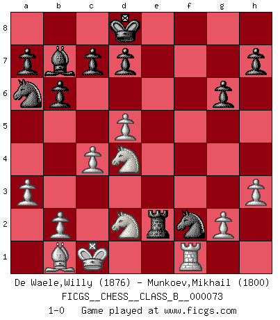 Last move : 1-0 2009 April 20 7:18:20 [Event "FICGS__CHESS__CLASS_B__000073"] [Site "FICGS"] [Date "2009.04.01"] [Round "1"] [White "De Waele,Willy"] [Black "Munkoev,Mikhail"] [Result "1-0"] [WhiteElo "1876"] [BlackElo "1800"] 1.e4 e6 2.d4 b6 3.c4 Bb7 4.Bd3 Bb4+ 5.Bd2 Bxd2+ 6.Nxd2 f5 7.Ngf3 Nf6 8.exf5 exf5 9.Qe2+ Qe7 10.Qxe7+ Kxe7 11.Bxf5 g6 12.Bc2 Nc6 13.O-O-O Rae8 14.d5 Nb4 15.Bb1 Kd8 16.Rhe1 Ng4 17.a3 Na6 18.h3 Nxf2 19.Rxe8+ Rxe8 20.Rf1 Re2 21.Nd4 1-0 French defense Queenside Castling by player White (move 13) Player White won this chess game. Follow this game move after move (download)It is not a move, even the best move that you must seek, but a realizable plan. (Eugene Znosko-Borovsky) Kasparov ist eine Art Monster mit hundert Augen, denen auch nicht das Geringste entgeht. (Tony Miles) Una buena memoria, concentración, imaginación y una fuerte voluntad, se requiere para llegar a ser un buen jugador. (Bobby Fischer) Roi des jeux et jeu des rois, les échecs portent en eux un sentiment d'infini. Ils donnent à celui qui s'est efforcé d'en approfondir les arcanes l'impression de n'être pas à la mesure de l'homme; en fait, ils constituent un résumé de l'univers, un microcosme, et figurent cette grande échelle qui, dans les plans de la lumière descend jusqu'à la matière, qui des abîmes insondables remonte jusqu'en l'infini de Dieu. (Pyrame) If you are going through hell, keep going. (Winston Churchill)