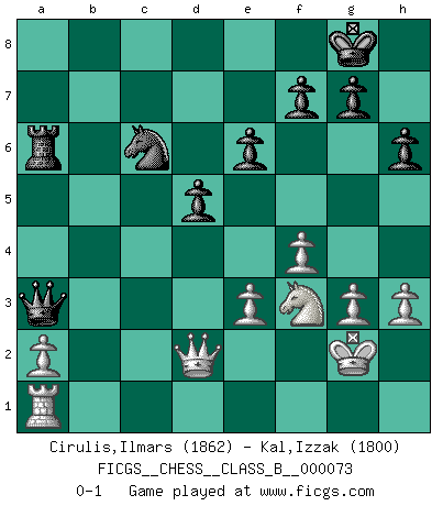 Last move : 0-1 2009 September 5 22:3:20 [Event "FICGS__CHESS__CLASS_B__000073"] [Site "FICGS"] [Date "2009.04.01"] [Round "1"] [White "Cirulis,Ilmars"] [Black "Kal,Izzak"] [Result "0-1"] [WhiteElo "1862"] [BlackElo "1800"] 1.f4 d5 2.d4 c5 3.dxc5 e6 4.Be3 Nc6 5.Nf3 Nf6 6.c3 Be7 7.b4 O-O 8.Nbd2 Ng4 9.Bd4 b6 10.g3 a5 11.e3 axb4 12.cxb4 bxc5 13.bxc5 Qa5 14.h3 Nf6 15.Kf2 Ne4+ 16.Kg2 Nxc5 17.Nb3 Qb6 18.Bxc5 Bxc5 19.Nxc5 Qxc5 20.Qd2 Na5 21.Qd4 Qa3 22.Be2 Ba6 23.Bxa6 Rxa6 24.Rhd1 Nc6 25.Qd2 Rb8 26.Qe2 Rb2 27.Rd2 Rxd2 28.Qxd2 h6 0-1 Bird's Opening Kingside Castling by player Black (move 7) Player Black won this chess game. Follow this game move after move (download)For surely of all the drugs in the world, Chess must be the most permanently pleasurable. (Assiac) Schach wird sich dank seiner hohen kulturellen Tradition immer durchsetzen. In näherer Zukunft womöglich sogar als Gegenreaktion auf die maßlose Reizüberflutung im Freizeit- und Spielbereich. (Garry Kasparov) El Ajedrez se juega con la mente... ¡no con las manos!. (Renaud y Kahn) Les erreurs sont comme les malheurs, elles n'arrivent jamais seules. (Siegbert Tarrasch) Don't anthropomorphize computers - they hate it. (Anonymous)