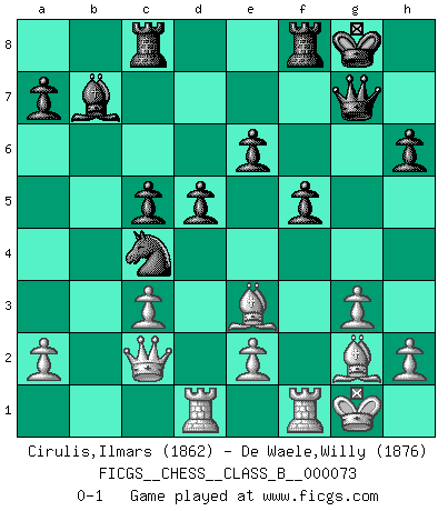 Last move : 0-1 2009 September 10 16:55:39 [Event "FICGS__CHESS__CLASS_B__000073"] [Site "FICGS"] [Date "2009.04.01"] [Round "1"] [White "Cirulis,Ilmars"] [Black "De Waele,Willy"] [Result "0-1"] [WhiteElo "1862"] [BlackElo "1876"] 1.c3 Nf6 2.Nf3 c5 3.d4 e6 4.g3 d5 5.Bg2 Nc6 6.O-O Be7 7.Qc2 O-O 8.Bf4 b6 9.Na3 Bb7 10.Rad1 h6 11.dxc5 bxc5 12.Nc4 g5 13.Bc1 Qc7 14.Ne3 Rad8 15.b3 Ne4 16.Ne1 f5 17.f3 Nd6 18.Nd3 Qb6 19.Nb2 Ne5 20.f4 gxf4 21.Rxf4 Bg5 22.Na4 Qc7 23.R4f1 Rc8 24.Nb2 Qg7 25.Nbc4 Ndxc4 26.bxc4 Bxe3+ 27.Bxe3 Nxc4 0-1 Saragossa Opening Kingside Castling by player White (move 6) Kingside Castling by player Black (move 7) Player Black won this chess game. Follow this game move after move (download)If a ruler does not understand Chess, how can he rule over a kingdom ? (King Khusros II) Stelle das Brett so, daß die Sonne in die Augen deines Gegners scheint. (Ruy López) A la fecha, Fischer esta simplemente un nivel arriba de todos los mejores jugadores de Ajedrez del mundo. (John Jacobs) Les écrivains ont utilisé les échecs pour analyser les côtés extrêmes de la nature humaine. Dans ce cadre, les échecs offrent un champ d'expérimentation idéal. Mais on pourrait faire la même chose avec la peinture. Et là, en vous référant à Van Gogh, vous ne tirerez pas de conclusion définitive sur les peintres. (Gary Kasparov) The difference between stupidity and genius is that genius has its limits. (Murphy)