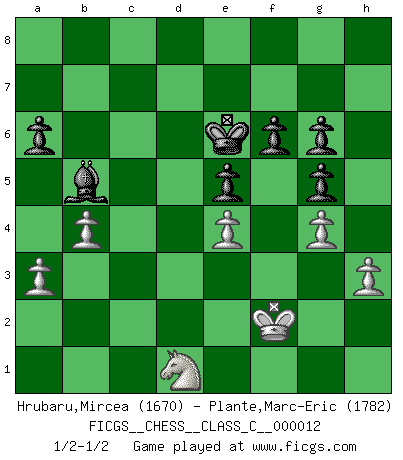 Last move : 1/2-1/2 2007 May 12 16:14:6 [Event "FICGS__CHESS__CLASS_C__000012"] [Site "FICGS"] [Date "2006.09.07"] [Round "1"] [White "Hrubaru,Mircea"] [Black "Plante,Marc-Eric"] [Result "1/2-1/2"] [WhiteElo "1670"] [BlackElo "1782"] 1.e4 c5 2.Nf3 d6 3.d4 cxd4 4.Nxd4 Nf6 5.Nc3 a6 6.h3 e6 7.g4 d5 8.Bg2 Nxe4 9.Nxe4 dxe4 10.Bxe4 Nd7 11.Bg2 Bc5 12.Nb3 Bb6 13.O-O O-O 14.Be3 Bxe3 15.fxe3 Qc7 16.Qd4 e5 17.Qb4 Qxc2 18.Rad1 h6 19.Rd2 Qg6 20.Qe7 Qg5 21.Qxg5 hxg5 22.Na5 Rb8 23.Bxb7 Bxb7 24.Rxd7 Be4 25.b3 f6 26.Rfd1 Rfc8 27.Nc4 Bc6 28.Ra7 Ra8 29.Rxa8 Bxa8 30.Nb6 Bf3 31.Nxc8 Bxd1 32.Kf2 Bc2 33.Nd6 Bb1 34.a3 Bc2 35.b4 Kf8 36.Ke2 Ba4 37.e4 Ke7 38.Nf5+ Kf8 39.Kf3 Bb5 40.Ne3 Kf7 41.Nd1 Ke6 42.Ke3 g6 43.Kf2 1/2-1/2 Sicilian : Najdorf, Adams attack Kingside Castling by player White (move 13) Kingside Castling by player Black (move 13) This chess game ended in a draw. Follow this game move after move (download)Your body has to be in top condition. Your Chess deteriorates as your body does. You can't separate body from mind. (Bobby Fischer) Es gibt keine einzige Frau, der ich nicht einen Springer vorgeben könnte und trotzdem gewänne. (Robert James Fischer) El juego de Damas es para vagabundos. (Paul Morphy) Les Cavaliers se révèlent fort utiles dans les positions fermées. D'habitude, les Fous sont un peu plus forts que les Cavaliers dans les positions ouvertes. Qu'on le veuille ou non, il restera toujours des exceptions ! No, no, you're not thinking; you're just being logical. (Niels Bohr)