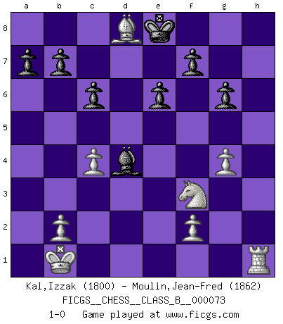 Last move : 1-0 2009 July 15 11:55:5 [Event "FICGS__CHESS__CLASS_B__000073"] [Site "FICGS"] [Date "2009.04.01"] [Round "1"] [White "Kal,Izzak"] [Black "Moulin,Jean-Fred"] [Result "1-0"] [WhiteElo "1800"] [BlackElo "1862"] 1.e4 c6 2.d4 d5 3.Nc3 dxe4 4.Nxe4 Bf5 5.Ng3 Bg6 6.h4 h6 7.Nf3 Nd7 8.h5 Bh7 9.Be3 Ngf6 10.Bd3 Bxd3 11.Qxd3 e6 12.O-O-O Be7 13.Ne4 Nxh5 14.Rxh5 Nf6 15.Nxf6+ Bxf6 16.g4 g6 17.Rxh6 Qd5 18.Rxh8+ Bxh8 19.Bg5 Qxa2 20.c4 Rd8 21.Rh1 Qa1+ 22.Qb1 Qxb1+ 23.Kxb1 Bxd4 24.Bxd8 1-0 Caro-Kann : Classical, 7...Nd7 Queenside Castling by player White (move 12) Player White won this chess game. Follow this game move after move (download)Chess demands total concentration. (Bobby Fischer) Im Schach gewinnt jeder. Hat man Freunde am Spiel - und das ist die Hauptsache - ist auch der Verlust einer Partie kein Unglück. (David Bronstein) En manos de Fischer's, una diminuta ventaja teórica es tan buena como tener una Reina de ventaja. (Isaac Kashdan) Toutes les manuvres exécutées sur une colonne ouverte ont pour but ultime l'intrusion définitive sur la septième ou la huitième rangée, en plein cur de la position ennemie. (Aaron Nimzovitch) Fame, I have already. Now I need the money. (an elderly Steinitz)
