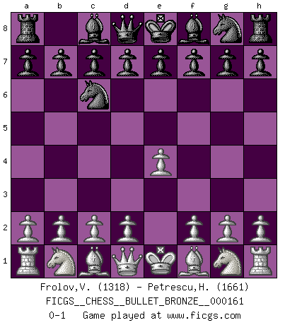 Last move : 0-1 2009 December 18 19:50:11 [Event "FICGS__CHESS__BULLET_BRONZE__000161"] [Site "FICGS"] [Date "2009.12.18"] [Round "1"] [White "Frolov,Valery"] [Black "Petrescu,Horatiu Adrian"] [Result "0-1"] [WhiteElo "1318"] [BlackElo "1661"] 1.e4 Nc6 0-1 This chess game has been lost on time (started : 2009.12.18 17:45:36) KP : Nimzovich defense Player Black won this chess game. Follow this game move after move (download)No Chess Grandmaster is normal; they only differ in the extent of their madness. (Viktor Korchnoi) Sie bekommen vielleicht den Eindruck, dass die Spitzenspieler überhaupt gar nicht so stark sind. Aber das stimmt nicht. Es ist eine Illusion. Mit einem Computer an der Seite ist es sehr leicht, Urteile zu fällen, aber wenn man alleine am Brett sitzt, sieht die Sache ganz anders aus. (Vladimir Kramnik) El Ajedrez es realmente noventa y nueve por ciento calculación. (Soltis) Je fais ceci parce que dans cinquante coups j'obtiendrai cela; je m'appelle Mikhail Moisevitch Botvinnik. (Botvinnik) Dave, my mind is going. I can feel it. (HAL 9000 in 2001, a space odyssey)