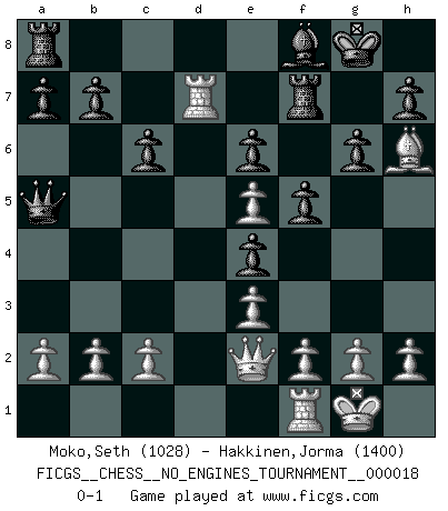 Last move : 0-1 2009 July 7 10:2:41 [Event "FICGS__CHESS__NO_ENGINES_TOURNAMENT__000018"] [Site "FICGS"] [Date "2009.04.03"] [Round "1"] [White "Moko,Seth"] [Black "Hakkinen,Jorma"] [Result "0-1"] [WhiteElo "1028"] [BlackElo "1400"] 1.d4 c6 2.Bf4 d5 3.Nf3 Nf6 4.e3 Bf5 5.Bd3 Bxd3 6.Qxd3 e6 7.O-O Be7 8.Nbd2 O-O 9.Ng5 g6 10.Ndf3 Nbd7 11.Ne5 Nxe5 12.dxe5 Ne4 13.Nxe4 dxe4 14.Qe2 f5 15.Bh6 Rf7 16.Rad1 Qa5 17.Rd7 Bf8 0-1 Queen's pawn Kingside Castling by player White (move 7) Kingside Castling by player Black (move 8) Player Black won this chess game. Follow this game move after move (download)We like to think. (Gary Kasparov) Später, ... hatte ich zunehmend Erfolg in entscheidenden Partien. Vielleicht weil ich eine einfache Wahrheit erkannte: nicht nur ich hatte Angst, auch mein Gegner. (Mikhail Nekhemyevich Tal) El Ajedrez se juega con la mente... ¡no con las manos!. (Renaud y Kahn) Des combinaisons [dans le jeu d'échecs] pareilles à des mélodies. Je crois entendre pour ainsi dire la musique des coups... (Vladimir Nabokov) The large trees attract high winds. (Chinese proverb)