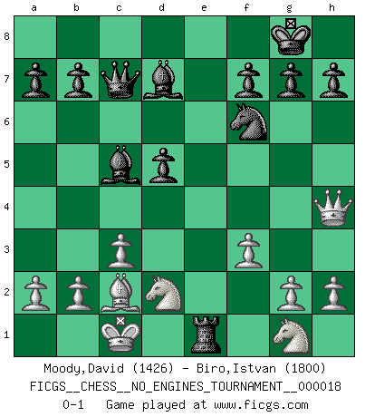 Last move : 0-1 2009 April 7 5:43:30 [Event "FICGS__CHESS__NO_ENGINES_TOURNAMENT__000018"] [Site "FICGS"] [Date "2009.04.03"] [Round "1"] [White "Moody,David"] [Black "Biro,Istvan"] [Result "0-1"] [WhiteElo "1426"] [BlackElo "1800"] 1.e4 c6 2.d4 d5 3.exd5 cxd5 4.Bd3 Nc6 5.c3 Qc7 6.Ne2 Bg4 7.f3 Bd7 8.Bf4 e5 9.dxe5 Nxe5 10.Bc2 Nf6 11.Qd4 Bd6 12.Nd2 O-O 13.O-O-O Rfe8 14.Rhe1 Bc5 15.Bxe5 Rxe5 16.Qh4 Rae8 17.Ng1 Rxe1 18.Rxe1 Rxe1+ 0-1 Caro-Kann : Exchange variation Kingside Castling by player Black (move 12) Queenside Castling by player White (move 13) Player Black won this chess game. Follow this game move after move (download)Not only will I predict his triumph over Botvinnik, but I'll go further and say that he'll probably be the greatest Chess player that ever lived. (John Collins) Habe Mut, dich deines eigenen Verstandes zu bedienen. (Immanuel Kant) ¿Que sería del Ajedrez sin errores graciosos?. (Kurt Richter) Il s'avisa de me proposer d'apprendre les échecs qu'il jouait un peu... me voilà forcené des échecs. J'achète un échiquier, je m'enferme dans ma chambre, j'y passe des jours et des nuits à vouloir apprendre par cur toutes les parties. (Jean-Jacques Rousseau, Confessions) Coffee just isn't my cup of tea. (Unknown)