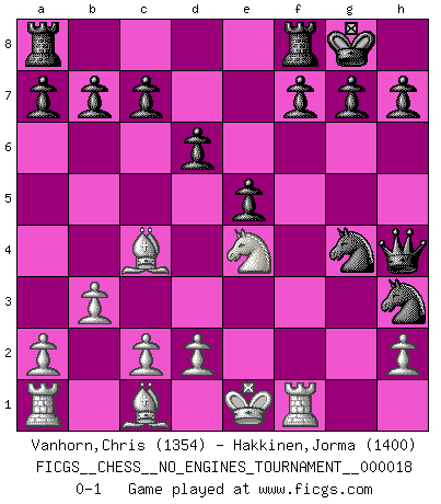 Last move : 0-1 2009 June 21 20:34:37 [Event "FICGS__CHESS__NO_ENGINES_TOURNAMENT__000018"] [Site "FICGS"] [Date "2009.04.03"] [Round "1"] [White "Vanhorn,Chris"] [Black "Hakkinen,Jorma"] [Result "0-1"] [WhiteElo "1354"] [BlackElo "1400"] 1.e4 e5 2.Bc4 Nf6 3.Qe2 Bc5 4.b3 O-O 5.Qf3 d6 6.Nh3 Bxh3 7.gxh3 Nbd7 8.Qg3 Nxe4 9.Qg4 Ndf6 10.Qh4 Bxf2+ 11.Qxf2 Nxf2 12.Rf1 Nxh3 13.Nc3 Ng4 14.Ne4 Qh4+ 0-1 Bishop's Opening : Berlin defense Kingside Castling by player Black (move 4) Player Black won this chess game. Follow this game move after move (download)The Chess pieces are the block alphabet which shapes thoughts; and these thoughts, although making a visual design on the chessboard, express their beauty abstractly, like a poem. (Marcel Duchamp) In Buenos Aires ist es nicht mein vorrangiges Ziel ein starkes Turnier zu organisieren, sondern ein Turnier für Gentlemen. Ich würde nie Kamsky einladen. Ich mag keine Probleme. (Miguel Najdorf) No nos podemos resistir a la fascinación de un sacrificio ya que la pasión por los sacrificios es parte de la naturaleza de un jugador de Ajedrez. (Rudolf Spielman) Karpov est une pièce de musée. (Garry Kasparov) The greatest con, that he ever pulled... was making you believe... that he is you. (Revolver, movie)