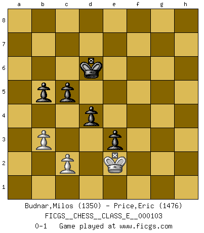 Last move : 0-1 2009 June 16 7:24:50 [Event "FICGS__CHESS__CLASS_E__000103"] [Site "FICGS"] [Date "2009.04.03"] [Round "1"] [White "Budnar,Milos"] [Black "Price,Eric"] [Result "0-1"] [WhiteElo "1350"] [BlackElo "1476"] 1.e4 e5 2.Nf3 Nc6 3.Bc4 Nf6 4.Nc3 Nxe4 5.Nxe4 d5 6.Bxd5 Qxd5 7.d3 Bf5 8.Qe2 O-O-O 9.O-O Nd4 10.Nxd4 exd4 11.Bf4 Bxe4 12.Qxe4 Qxe4 13.dxe4 h6 14.Rad1 Be7 15.Rd3 Bg5 16.Be5 Bf6 17.Bxf6 gxf6 18.Rfd1 c5 19.b3 Rd7 20.g4 h5 21.f3 hxg4 22.fxg4 Re7 23.Re1 Rg8 24.h3 f5 25.Rd2 fxe4 26.Rde2 e3 27.Kg2 f5 28.Kg3 fxg4 29.hxg4 Reg7 30.Kf3 Rxg4 31.Rh2 Rg3+ 32.Ke4 Rg2 33.Re2 Rxe2 34.Rxe2 Kd7 35.Kd5 b6 36.a4 Rf8 37.Kc4 Rf2 38.Kd3 Rxe2 39.Kxe2 a6 40.Kd3 b5 41.axb5 axb5 42.Ke2 Kd6 0-1 Two knights defense Queenside Castling by player Black (move 8) Kingside Castling by player White (move 9) 10 pieces endgame at move 39 : White KPPP , Black KPPPPP WHITE : King + 3 Pawns BLACK : King + 5 Pawns 9 pieces endgame at move 41 : White KPPP , Black KPPPP WHITE : King + 3 Pawns BLACK : King + 4 Pawns 8 pieces endgame at move 41 : White KPP , Black KPPPP WHITE : King + 2 Pawns BLACK : King + 4 Pawns Player Black won this chess game. Follow this game move after move (download)The only thing Chess players have in common is Chess. (Lodewijk Prins) Ich bewundere Kasparows phantasievolle Angriffssiege aus den Achtzigern und Neunzigern, aber wenn man sie mit dem Computer überprüft, nimmt der Computer in jeder zweiten Partie die Opfer an, verteidigt sich und gewinnt. (Vladimir Kramnik) Repentinamente, me resultaba obvio en mi analisis que yo había pasado por alto lo que Fischer había visto en el tablero con la mas grande facilidad. (Mikhail Botvinnik) Je ne suis pas le dernier à jouer lâchement des coups douteux pendant le zeïtnot de l'adversaire pour l'achever: en effet les coups qui font le plus peur sont ceux que l'on ne comprend pas. Je me fais souvent peur quand je joue. (Un professeur anonyme) Life is like a play: it's not the length but the excellence of the acting that matters. (Seneca)