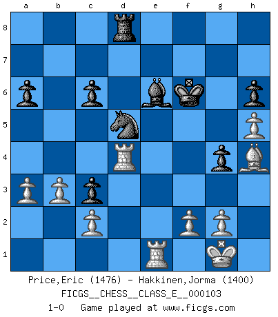Last move : 1-0 2009 June 14 9:33:26 [Event "FICGS__CHESS__CLASS_E__000103"] [Site "FICGS"] [Date "2009.04.03"] [Round "1"] [White "Price,Eric"] [Black "Hakkinen,Jorma"] [Result "1-0"] [WhiteElo "1476"] [BlackElo "1400"] 1.e4 e5 2.Nf3 Nc6 3.Bb5 f5 4.Nc3 Nf6 5.exf5 Bb4 6.O-O d5 7.Nxe5 Bxf5 8.Nxc6 bxc6 9.Bxc6+ Bd7 10.Bxa8 Qxa8 11.Re1+ Kf7 12.Qf3 d4 13.Qxa8 Rxa8 14.a3 Bxc3 15.dxc3 dxc3 16.b3 Nd5 17.Bg5 h6 18.Bh4 g5 19.Bg3 Be6 20.Rad1 Re8 21.Re5 c6 22.Rd3 Kg6 23.h4 g4 24.h5+ Kf6 25.Re1 a6 26.Rd4 Rd8 27.Bh4+ 1-0 Ruy Lopez : Schliemann defense, Berger variation Kingside Castling by player White (move 6) Player White won this chess game. Follow this game move after move (download)Chess is life. (Bobby Fischer) Schachspieler können ausgezeichnet Varianten am Schachbrett berechnen, aber nicht im realen Leben. Zu stark ist der Individualismus im Schach ausgeprägt, und für viele ist ein kleiner momentaner persönlicher Vorteil wichtiger als ein weit größerer Vorteil von morgen. (Anatoly Karpov) El Ajedrez era la lengua materna de Capablanca. (Reti) Shah mat. Le roi est mort. Cri de fierté d'un joueur venant de terrasser son adversaire, courtoisement, sans effusion de sang. May the force be with you. (Han Solo in Star Wars ep.4)