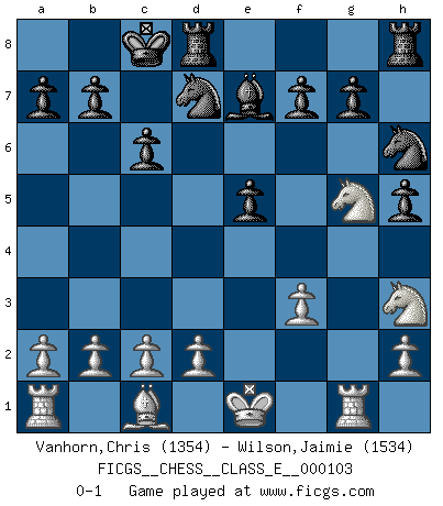 Last move : 0-1 2009 June 21 8:33:38 [Event "FICGS__CHESS__CLASS_E__000103"] [Site "FICGS"] [Date "2009.04.03"] [Round "1"] [White "Vanhorn,Chris"] [Black "Wilson,Jaimie"] [Result "0-1"] [WhiteElo "1354"] [BlackElo "1534"] 1.e3 d5 2.Bb5+ c6 3.Bf1 e5 4.g3 Nf6 5.Bh3 Bxh3 6.Nxh3 Qc8 7.g4 Qxg4 8.Qxg4 Nxg4 9.Nc3 Nd7 10.Rg1 h5 11.f3 Nh6 12.e4 dxe4 13.Nxe4 O-O-O 14.Neg5 Be7 0-1 Van't Kruijs Opening Queenside Castling by player Black (move 13) Player Black won this chess game. Follow this game move after move (download)Every Chess master was once a beginner. (Chernev) Kostenjuk hat keinen Sexappeal. (Loek van Wely) El Ajedrez es el gimnasio de la mente. (Blaise Pascal) La conception d'un plan est le processus par lequel un joueur exploite les avantages de sa position tout en s'efforçant d'en réduire au minimum les inconvénients. Afin de garantir le succès, un plan doit toujours se fonder sur un diagnostic objectif des particularités d'une position. La conception d'un plan est d'autant plus difficile que la position est équilibrée, et grandement facilitée lorsqu'il n'existe qu'un seul plan susceptible de répondre aux exigences de la position. (Harry Golombek) If I had no sense of humor, I would long ago have committed suicide. (Mahatma Gandhi)