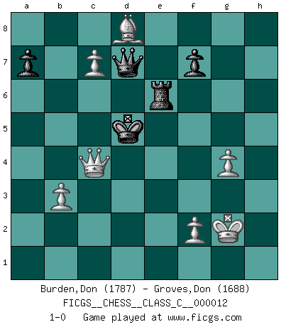 Last move : 1-0 2006 October 10 2:10:51 [Event "FICGS__CHESS__CLASS_C__000012"] [Site "FICGS"] [Date "2006.09.07"] [Round "1"] [White "Burden,Don"] [Black "Groves,Don"] [Result "1-0"] [WhiteElo "1787"] [BlackElo "1688"] 1.e4 d6 2.d4 g6 3.g3 Bg7 4.Bg2 c5 5.dxc5 Qa5+ 6.c3 dxc5 7.Nf3 Nc6 8.h3 Be6 9.O-O h6 10.e5 Nxe5 11.Nxe5 Bxe5 12.Re1 Rd8 13.Qc2 Bd6 14.Na3 g5 15.Bxb7 Bxh3 16.Qe4 Kf8 17.Nc4 Qc7 18.Nxd6 Rxd6 19.Qh1 Be6 20.b3 Kg7 21.c4 Nf6 22.Bb2 Rd7 23.Bc6 R7d8 24.Bd5 Bxd5 25.cxd5 Rd7 26.Qf3 Qb6 27.Re5 c4 28.Rae1 cxb3 29.axb3 Re8 30.Rf5 Rd6 31.Kg2 Qd8 32.Be5 Rb6 33.Rh1 Rh8 34.Rc1 Kg6 35.g4 Kg7 36.Rc6 Rxc6 37.dxc6 Re8 38.c7 Qd7 39.Rxf6 exf6 40.Qxf6+ Kf8 41.Qxh6+ Ke7 42.Qxg5+ Ke6 43.Qf5+ Ke7 44.Qf6+ Kf8 45.Qh6+ Ke7 46.Bf6+ Kd6 47.Bd8 Re6 48.Qf4+ Kc6 49.Qa4+ Kd6 50.Qa6+ Ke5 51.Qe2+ Kd5 52.Qc4+ 1-0 King's pawn Opening Kingside Castling by player White (move 9) Player White won this chess game. Follow this game move after move (download)Chess is war over the board. The object is to crush the opponents mind. (Bobby Fischer) Der vorletzte Fehler gewinnt. (Savielly Grigorievitsch Tartakower) Todavía soy una víctima del Ajedrez. Tiene toda la belleza del arte y mucho mas. No puede ser comercializado. El Ajedrez es mas puro que el arte en su posición social. (Marcel Duchamp) On a dit que l'homme se distingue de l'animal par le fait qu'il achète plus de livres qu'il ne peut en lire. Je voudrais suggérer qu'inclure à la liste des livres quelques livres d'échecs rendrait la distinction manifeste. (Edward Lasker) I would love to change the world, but they won't give me the source code. (Unknown)