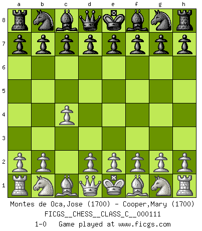 Last move : 1-0 2009 May 15 6:4:23 [Event "FICGS__CHESS__CLASS_C__000111"] [Site "FICGS"] [Date "2009.04.03"] [Round "1"] [White "Montes de Oca,Jose"] [Black "Cooper,Mary"] [Result "1-0"] [WhiteElo "1700"] [BlackElo "1700"] 1.c4 1-0 This chess game has been lost on time (started : 2009.04.03 21:41:48) English Opening Player White won this chess game. Follow this game move after move (download)My opponents make good moves too. Sometimes I don't take these things into consideration. (Bobby Fischer) Verschiedene, sehr schätzbare und im Laufe des Lebens nützliche Eigenschaften des Geistes können durch das Schachspiel erworben und gekräftigt werden, so dass sie zu Gewohnheiten werden, die uns nie im Stich lassen. (Benjamin Franklin) Cuando le juegas a Fischer, no es una cuestion de si vas a ganar o perder. Es una cuestion de si vas a sobrevivir. (Boris Spassky) J'apprécie les joueurs d'est-indienne, c'est grâce à eux que je nourris ma famille depuis tant d'années. (Petrosian) Luck is the residue of design. (John Milton)