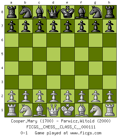 Last move : 0-1 2009 May 14 5:51:15 [Event "FICGS__CHESS__CLASS_C__000111"] [Site "FICGS"] [Date "2009.04.03"] [Round "1"] [White "Cooper,Mary"] [Black "Parwicz,Witold"] [Result "0-1"] [WhiteElo "1700"] [BlackElo "2000"] 0-1 This chess game has been lost on time (started : 2009.04.03 21:41:48) Player Black won this chess game. Follow this game move after move (download)The essence of Chess is thinking about what Chess is. (David Bronstein) Obendrein hat der FIDE-Präsident den Revolutionsführer Gaddafi zum »Großmeister« ernannt, am Ende der WM. Das ist lächerlich! (Joel Lautier) El Jaque al descubierto es el bombardero del tablero. (Reuben Fine) Une platitude souvent récitée à propos des Echecs est qu'une des choses les plus difficiles à réaliser est de gagner une position gagnante. Cela ne manque pas de sens mais, pour ma part, j'ai toujours trouvé plus difficile de gagner une position perdante. (Tim Krabbe) Everything in life is luck. (Donald Trump)