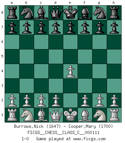 Last move : 1-0 2009 May 14 5:51:15 [Event "FICGS__CHESS__CLASS_C__000111"] [Site "FICGS"] [Date "2009.04.03"] [Round "1"] [White "Burrows,Nick"] [Black "Cooper,Mary"] [Result "1-0"] [WhiteElo "1647"] [BlackElo "1700"] 1.e4 1-0 This chess game has been lost on time (started : 2009.04.03 21:41:48) King's pawn Opening Player White won this chess game. Follow this game move after move (download)Adequate compensation for a sacrifice is having a sound combination leading to a winning position; adequate compensation for a blunder is having your opponent snatch defeat from the jaws of victory. (Bruce A. Moon) Über die Verhaftung Bobby Fischers: Warum es die Bush-Administration für nötig befindet einen 61 Jahre alten Mann zu hetzten, der für niemanden ausser sich selbste eine Gefahr darstellt ist ein Rätsel. (Nigel Short) No hay precio que no valga la pena por la cabellera del Rey enemigo. (Koblentz) Tout change constamment, y compris dans le monde des Echecs. (Botvinnik) Perhaps chess is the wrong game for the times (The Chess Master and the Computer, by Garry Kasparov - 2010)