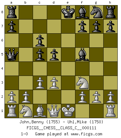 Last move : 1-0 2009 May 28 18:48:4 [Event "FICGS__CHESS__CLASS_C__000111"] [Site "FICGS"] [Date "2009.04.03"] [Round "1"] [White "John,Benny"] [Black "Uhl,Mike"] [Result "1-0"] [WhiteElo "1755"] [BlackElo "1750"] 1.e4 e6 2.Bc4 d5 3.exd5 exd5 4.Bb3 c5 5.d3 Nc6 6.Ba4 Qa5+ 7.c3 Bf5 8.Bxc6+ bxc6 9.Nf3 1-0 This chess game has been lost on time (started : 2009.04.03 21:41:48) French defense Player White won this chess game. Follow this game move after move (download)After a bad opening, there is hope for the middle game. After a bad middle game, there is hope for the endgame. But once you are in the endgame, the moment of truth has arrived. (Edmar Mednis) Schach wird sich dank seiner hohen kulturellen Tradition immer durchsetzen. In näherer Zukunft womöglich sogar als Gegenreaktion auf die maßlose Reizüberflutung im Freizeit- und Spielbereich. (Garry Kasparov) La caracteristica mas importante en la posición del Ajedrez es la actividad de las piezas. Esto es absolutamente fundamental en todas las fases del juego: Apertura, Juego Medio y especialmente Finales. La limitación primordial en la actividad de una pieza, es la estructuración de los Peones. (Michael Stean) Le thème de l'attaque double intervient d'une manière ou d'une autre dans l'immense majorité des combinaisons. (Youri Averbakh) When it is a question of money, everybody is of the same religion. (Voltaire)