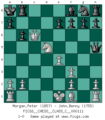 Last move : 1-0 2009 July 31 0:0:12 [Event "FICGS__CHESS__CLASS_C__000111"] [Site "FICGS"] [Date "2009.04.03"] [Round "1"] [White "Morgan,Peter"] [Black "John,Benny"] [Result "1-0"] [WhiteElo "1857"] [BlackElo "1755"] 1.c4 d5 2.cxd5 Qxd5 3.Nc3 Qd8 4.Nf3 Bf5 5.e4 Bg4 6.Qb3 Bxf3 7.gxf3 b6 8.d4 Qxd4 9.Nd5 Kd8 10.Be3 Qe5 11.Bf4 Qh5 12.Bxc7+ Kc8 13.Qc2 Kb7 14.Bxb8 Rxb8 15.Qc7+ Ka8 16.Qc6+ 1-0 This chess game has been lost on time (started : 2009.04.03 21:41:48) English Opening Player White won this chess game. Follow this game move after move (download)He who fears an isolated Queen's Pawn should give up Chess. (Siegbert Tarrasch) Als er Schachweltmeister wurde ließ er praktisch alle stärksten Sovietspieler für sich arbeiten. Wenn ein auch nur mittelmässiger Meister ein Spezialist für eine bestimmte Eröffnung war, wurde er von Karpov gerufen. Das wurde alles geheim gehalten. (Mikhail Moiseyevich Botvinik) No hay precio que sea tan grande por la cabellera del Rey enemigo. (Koblentz) Le moment que je préfère le plus dans une rencontre, c'est celui où je sens que la personnalité de l'adversaire se brise. (Robert Fischer) In fact if nothing is done against this teddy bear, hereby I announce that I would quit chess, rapid chess, blitz chess, postal chess, email chess, server chess and correspondence chess I will then switch to a table game where teddy bears aren't going to be seen for a while, like Poker, or Roulette, all 18+ games. (Elmer Valderrama)