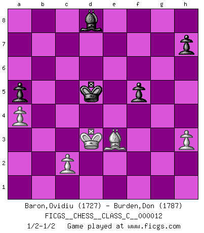 Last move : 1/2-1/2 2006 November 2 14:40:34 [Event "FICGS__CHESS__CLASS_C__000012"] [Site "FICGS"] [Date "2006.09.07"] [Round "1"] [White "Baron,Ovidiu"] [Black "Burden,Don"] [Result "1/2-1/2"] [WhiteElo "1727"] [BlackElo "1787"] 1.e4 c5 2.Nf3 d6 3.d4 cxd4 4.Nxd4 Nf6 5.Nc3 a6 6.Be3 e5 7.Nb3 Be6 8.f4 Ng4 9.Bd2 Qb6 10.Qf3 exf4 11.Qxf4 Nd7 12.Be2 Nge5 13.Be3 Qc7 14.Nd4 b5 15.Qg3 Nf6 16.O-O Be7 17.a3 O-O 18.Nf5 Bxf5 19.Rxf5 Qb7 20.Bd3 a5 21.Re1 b4 22.Nd5 Nxd5 23.exd5 bxa3 24.bxa3 Qxd5 25.Kh1 g6 26.Bh6 Rfe8 27.Be4 Qe6 28.Rxe5 dxe5 29.Bxa8 Rxa8 30.Rxe5 Bd6 31.Rxe6 Bxg3 32.Rc6 Be5 33.a4 f6 34.g3 Kf7 35.Bd2 Ra7 36.Kg2 Rc7 37.Rxc7+ Bxc7 38.Kf3 Ke6 39.Ke4 Bb6 40.Kd3 Kd5 41.g4 Bc7 42.h3 f5 43.gxf5 gxf5 44.Be3 Bd8 1/2-1/2 Sicilian : Najdorf, Byrne (English) attack Kingside Castling by player White (move 16) Kingside Castling by player Black (move 17) 10 pieces endgame at move 43 : White KBPPP , Black KBPPP WHITE : King + 1 Bishop 3 Pawns BLACK : King + 1 Bishop 3 Pawns This chess game ended in a draw. Follow this game move after move (download)The only thing Chess players have in common is Chess. (Lodewijk Prins) Frage: Wie viele Autos haben Sie schon zerstört? - Antwort: Nur zwei. (Loek van Wely) El Rey es una pieza de pelea. ¡Usenlo!. (Wilhelm Steinitz) Soyez une menace à chaque fois que vous vous asseyez pour jouer. (Ken Smith) It is not enough to be a good player... you must also play well. (Siegbert Tarrasch)
