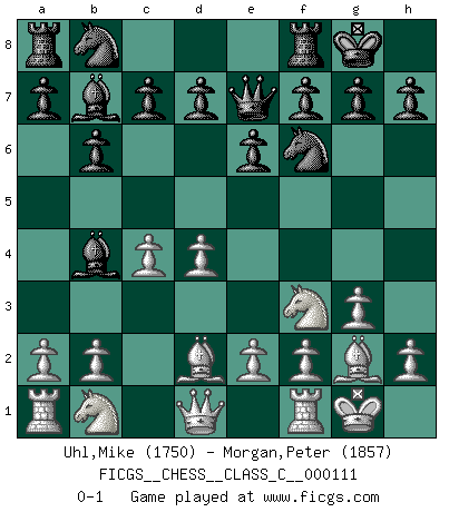 Last move : 0-1 2009 June 1 6:56:13 [Event "FICGS__CHESS__CLASS_C__000111"] [Site "FICGS"] [Date "2009.04.03"] [Round "1"] [White "Uhl,Mike"] [Black "Morgan,Peter"] [Result "0-1"] [WhiteElo "1750"] [BlackElo "1857"] 1.d4 Nf6 2.c4 e6 3.Nf3 b6 4.g3 Bb7 5.Bg2 Bb4+ 6.Bd2 Qe7 7.O-O O-O 0-1 This chess game has been lost on time (started : 2009.04.03 21:41:48) Queen's Indian : Capablanca variation Kingside Castling by player White (move 7) Kingside Castling by player Black (move 7) Player Black won this chess game. Follow this game move after move (download)Chess is a forcing house where the fruits of character can ripen more fully than in life. (Edward Morgan Foster) Drei Punkte vor allen anderen ist wie einer, der im weißen Anzug posiert, während der Rest in Müllsäcke gekleidet dasteht. (Viktor Kortschnoi) Hoy en día, si tu no eres un Gran Maestro a los 14 años, es mejor que lo olvides. (Anand Viswanathan) Les échecs sont un jeu par leur forme, un art par leur essence et une science par sa difficulté d'acquisition. Ils peuvent vous procurer autant de plaisir qu'un bon livre ou une belle musique, mais vous n'aurez une réelle joie que si vous arrivez à bien jouer. (Tigran Petrosian) Don't be discouraged. It's often the last key in the bunch that opens the lock. (Author unknown)