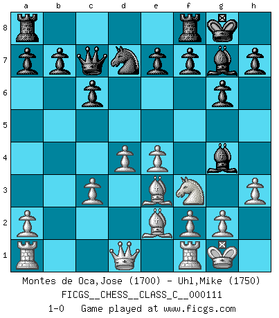 Last move : 1-0 2009 June 23 20:39:35 [Event "FICGS__CHESS__CLASS_C__000111"] [Site "FICGS"] [Date "2009.04.03"] [Round "1"] [White "Montes de Oca,Jose"] [Black "Uhl,Mike"] [Result "1-0"] [WhiteElo "1700"] [BlackElo "1750"] 1.c4 c6 2.Nf3 Nf6 3.Nc3 d5 4.e3 Bg4 5.cxd5 Nxd5 6.Be2 g6 7.O-O Bg7 8.d4 O-O 9.e4 Nxc3 10.bxc3 Qc7 11.Be3 Nd7 12.h3 1-0 English : Caro-Kann defensive system Kingside Castling by player White (move 7) Kingside Castling by player Black (move 8) Player White won this chess game. Follow this game move after move (download)Modern Chess is too much concerned with things like Pawn structure. Forget it, Checkmate ends the game. (Nigel Short) Schachspieler können ausgezeichnet Varianten am Schachbrett berechnen, aber nicht im realen Leben. Zu stark ist der Individualismus im Schach ausgeprägt, und für viele ist ein kleiner momentaner persönlicher Vorteil wichtiger als ein weit größerer Vorteil von morgen. (Anatoly Karpov) Alekhine es un poeta que crea un trabajo de arte de algo que raramente inspiraría a otra persona a mandar una tarjeta postal. (Max Euwe) Le génie consiste à savoir transgresser les règles au moment opportun. (Teichmann) When a man with money meets a man with experience, the man with experience leaves with money and the man with money leaves with experience. (Anonymous)
