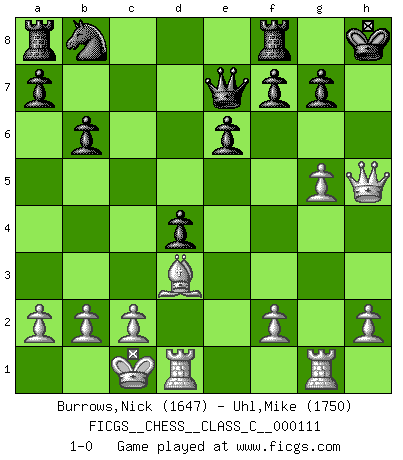 Last move : 1-0 2009 April 21 12:21:27 [Event "FICGS__CHESS__CLASS_C__000111"] [Site "FICGS"] [Date "2009.04.03"] [Round "1"] [White "Burrows,Nick"] [Black "Uhl,Mike"] [Result "1-0"] [WhiteElo "1647"] [BlackElo "1750"] 1.e4 e6 2.d4 d5 3.Nc3 Nf6 4.Bg5 dxe4 5.Nxe4 Be7 6.Bxf6 Bxf6 7.Nf3 O-O 8.Qd2 b6 9.O-O-O Bb7 10.Bd3 h6 11.Rhg1 Bxd4 12.g4 c5 13.g5 h5 14.Qf4 Qe7 15.Nf6+ Kh8 16.Nxd4 cxd4 17.Qh4 Bf3 18.Nxh5 Bxh5 19.Qxh5+ 1-0 French : Burn variation Kingside Castling by player Black (move 7) Queenside Castling by player White (move 9) Player White won this chess game. Follow this game move after move (download)Checkers is for tramps. (Paul Morphy) Wenn Capablanka heute auf der Schachbühne erscheinen würde, hätte er ein halbes Jahr gebraucht um sich die Schachtheorie anzueignen. Und dann hätte er alles und jeden besiegt. (Mikhail Moiseyevich Botvinik) No puedes jugar al Ajedrez si eres de corazón noble. (Proverbio Francés) Je ne crois pas en la psychologie, je crois aux bons coups. (Robert Fischer) If you don't practice you don't deserve to win. (Andre Agassi)