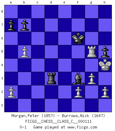 Last move : 0-1 2009 September 10 11:41:59 [Event "FICGS__CHESS__CLASS_C__000111"] [Site "FICGS"] [Date "2009.04.03"] [Round "1"] [White "Morgan,Peter"] [Black "Burrows,Nick"] [Result "0-1"] [WhiteElo "1857"] [BlackElo "1647"] 1.c4 e5 2.Nc3 Nf6 3.Nf3 Nc6 4.g3 d5 5.cxd5 Nxd5 6.d3 Be7 7.Bg2 Nb6 8.O-O O-O 9.Be3 Re8 10.Qc1 f6 11.Ne4 Bg4 12.Nc5 Bxc5 13.Qxc5 Qd7 14.Rfe1 Bh3 15.Bh1 Be6 16.Rec1 Nd5 17.Bd2 Bf7 18.b4 Nd8 19.e4 Ne7 20.Qxc7 Qxd3 21.Qc2 Qa3 22.Qc3 Qxc3 23.Rxc3 Ne6 24.Bg2 Nc6 25.b5 Ncd4 26.Nxd4 Nxd4 27.Bf1 Rad8 28.Kg2 Bg6 29.Re1 Bh5 30.Bc4+ Kh8 31.Bc1 Rc8 32.Bb2 Bf3+ 33.Kh3 h5 34.R3c1 g5 35.Bd3 Kg7 36.Rxc8 Rxc8 37.Bxd4 exd4 38.e5 fxe5 39.Rxe5 Kf6 40.Rf5+ Ke6 41.Rxg5 Rc3 42.Bf5+ Kf6 43.Kh4 d3 44.Bxd3 Rxd3 0-1 English Opening Kingside Castling by player White (move 8) Kingside Castling by player Black (move 8) Player Black won this chess game. Follow this game move after move (download)Fischer, who may or may not be mad as a hatter, has every right to be horrified. (Jeremy Silman) Ich war schon mal beim Dopingtest. Da musste ich Urin abgeben, während Dritte zusahen. (Elisabeth Pähtz) El Ajedrez detiene a su maestro dentro de sus propios vínculos, encadenando la mente y el cerebro, por lo que la libertad interior del mas fuerte debe sufrir. (Albert Einstein) J'ai vu le vaincu d'Echecs jouer des années durant dans l'espoir de la fête de la victoire. Car tu es plus riche de ce qu'elle existe si même elle n'est point pour toi. Ainsi de la perle du fond des mers. (Antoine de Saint-Exupéry) Establishing goals is all right if you don't let them deprive you of interesting detours. (Doug Larson)
