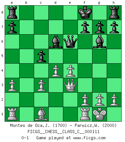 Last move : 0-1 2009 July 1 21:19:2 [Event "FICGS__CHESS__CLASS_C__000111"] [Site "FICGS"] [Date "2009.04.03"] [Round "1"] [White "Montes de Oca,Jose"] [Black "Parwicz,Witold"] [Result "0-1"] [WhiteElo "1700"] [BlackElo "2000"] 1.c4 c5 2.Nf3 Nc6 3.Nc3 e5 4.e3 Nf6 5.a3 d5 6.cxd5 Nxd5 7.Bb5 Nxc3 8.bxc3 Bd6 9.O-O e4 10.Qa4 Bf5 11.d4 exf3 12.Bxc6+ bxc6 13.Qxc6+ Kf8 14.Qxf3 Bg6 15.e4 Qf6 16.Qe3 Qe6 0-1 English : Symmetrical variation Kingside Castling by player White (move 9) Player Black won this chess game. Follow this game move after move (download)The older I grow, the more I value Pawns. (Keres) Schach ist mein Leben, meine Leidenschaft, was ich gelernt habe und seit meinem 14. Lebensjahr profimässig praktiziere. Darauf zu verzichten, würde mir sehr schwer fallen. (Viktor Kortschnoi) Algunos sacrificios son sólidos, los demás son míos. (Mikhail Tal) Il vaut mieux sacrifier les pièces de l'adversaire. (Xavier Tartacover) It's only after you lost everything, Tyler says, that you're free to do anything. (Chuck Palahniuk, Fight Club)