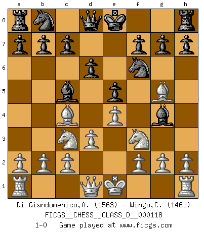 Last move : 1-0 2009 May 24 6:33:51 [Event "FICGS__CHESS__CLASS_D__000118"] [Site "FICGS"] [Date "2009.04.04"] [Round "1"] [White "Di Giandomenico,Alfonso"] [Black "Wingo,Cian"] [Result "1-0"] [WhiteElo "1563"] [BlackElo "1461"] 1.e4 e5 2.Bc4 Bc5 3.Nc3 Nf6 4.d3 d6 5.Nf3 Bg4 6.Bg5 1-0 This chess game has been lost on time (started : 2009.04.04 5:11:24) Bishop's Opening : Classical variation Player White won this chess game. Follow this game move after move (download)Play the opening like a book, the middle game like a magician, and the endgame like a machine. (Spielmann) Moralische Siege zählen nicht. (Savielly Grigorievitsch Tartakower) Cuando tu casa esta en llamas, no puedes ser molestado por tus vecinos. O, como decinos en Ajedrez, si tu Rey esta bajo ataque, no te preocupa perder un Peón del lado de la Reina. (Gary Kasparov) Si je n'étais pas joueur d'échecs, je serais le meilleur dans quelque chose d'autre. (Anatoli Karpov) That's absurd. I love it. (Gregory House, House M.D.)