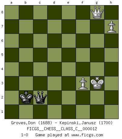 Last move : 1-0 2007 January 14 22:55:28 [Event "FICGS__CHESS__CLASS_C__000012"] [Site "FICGS"] [Date "2006.09.07"] [Round "1"] [White "Groves,Don"] [Black "Kepinski,Janusz"] [Result "1-0"] [WhiteElo "1688"] [BlackElo "1700"] 1.e4 e6 2.d3 d5 3.Nd2 c5 4.Ngf3 Nf6 5.g3 Nc6 6.Bg2 Be7 7.O-O Qc7 8.Re1 b6 9.Qe2 Bb7 10.e5 Nd7 11.h4 O-O-O 12.c4 h6 13.cxd5 exd5 14.Nb1 Kb8 15.e6 fxe6 16.Nc3 Ba6 17.Qxe6 Nf6 18.d4 Rhe8 19.Qf5 cxd4 20.Bf4 Bd6 21.Rxe8 Rxe8 22.Nxd5 Nxd5 23.Qxd5 Bxf4 24.Nxd4 Bb7 25.Nxc6+ Bxc6 26.Qxc6 Qxc6 27.Bxc6 Rc8 28.gxf4 Rxc6 29.Kg2 Rc2 30.Re1 Rxb2 31.Re8+ Kb7 32.Re7+ Ka6 33.Rxg7 Rxa2 34.Rh7 Rc2 35.Rxh6 Kb5 36.Rh7 a5 37.f5 a4 38.Ra7 Kb4 39.f6 Rc8 40.f7 b5 41.h5 Rf8 42.h6 a3 43.h7 Kb3 44.Kg3 a2 45.Ra5 b4 46.Kh4 Kb2 47.Kg5 b3 48.Kg6 Kc1 49.Kg7 b2 50.Kxf8 a1Q 51.Rxa1+ bxa1Q 52.Kg8 Qa8+ 53.f8Q Qd5+ 54.Qf7 Qg5+ 55.Kf8 Qd8+ 56.Kg7 Qg5+ 57.Qg6 Qe7+ 58.Kg8 Qd8+ 59.Kf7 Qd7+ 60.Kf6 Qd8+ 61.Kf5 Qd3+ 62.Kg5 Qd2+ 63.Kg4 Qd1+ 64.Kf4 Qd4+ 65.Kg3 Kb2 66.Qg8 Qe5+ 67.Kg2 Qe4+ 68.f3 Qe2+ 69.Kg3 Qe1+ 70.Kh2 Qe5+ 71.Kh3 Qf5+ 72.Kg2 Qc2+ 73.Kg3 1-0 French : King's Indian attack Kingside Castling by player White (move 7) Queenside Castling by player Black (move 11) 10 pieces endgame at move 33 : White KRPPP , Black KRPPP WHITE : King + 1 Rook 3 Pawns BLACK : King + 1 Rook 3 Pawns 9 pieces endgame at move 35 : White KRPPP , Black KRPP WHITE : King + 1 Rook 3 Pawns BLACK : King + 1 Rook 2 Pawns 8 pieces endgame at move 50 : White KRPPP , Black KPP WHITE : King + 1 Rook 3 Pawns BLACK : King + 2 Pawns Promotion Queen by player Black (move 50) 7 pieces endgame at move 51 : White KRPPP , Black KP WHITE : King + 1 Rook 3 Pawns BLACK : King + 1 Pawn Promotion Queen by player Black (move 51) 6 pieces endgame at move 51 : White KPPP , Black KQ WHITE : King + 3 Pawns BLACK : King + 1 Queen Promotion Queen by player White (move 53) Player White won this chess game. Follow this game move after move (download)The stomach is an essential part of the Chess master. (Bent Larsen) Drei Punkte vor allen anderen ist wie einer, der im weißen Anzug posiert, während der Rest in Müllsäcke gekleidet dasteht. (Viktor Kortschnoi) Por tratar de evitar la pérdida de una pieza, muchas personas han perdido una partida de Ajedrez. (Savielly Tartakover) Horreur, mais aussi harmonie suprême : qu'y avait-il en effet au monde en dehors des échecs ? Le brouillard, l'inconnu, le non-être... (Vladimir Nabokov) A good player is always lucky. (Capablanca)
