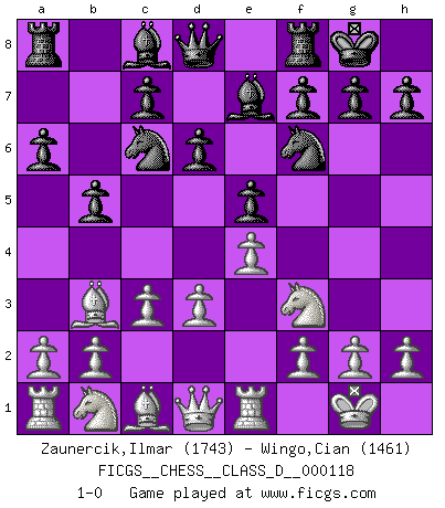 Last move : 1-0 2009 June 13 20:0:18 [Event "FICGS__CHESS__CLASS_D__000118"] [Site "FICGS"] [Date "2009.04.04"] [Round "1"] [White "Zaunercik,Ilmar"] [Black "Wingo,Cian"] [Result "1-0"] [WhiteElo "1743"] [BlackElo "1461"] 1.e4 e5 2.Nf3 Nc6 3.Bb5 a6 4.Ba4 Nf6 5.O-O Be7 6.Re1 b5 7.Bb3 d6 8.c3 O-O 9.d3 1-0 This chess game has been lost on time (started : 2009.04.04 5:11:24) Ruy Lopez : Closed Kingside Castling by player White (move 5) Kingside Castling by player Black (move 8) Player White won this chess game. Follow this game move after move (download)Chess is thirty to forty percent psychology. You don't have this when you play a computer. I can't confuse it. (Judith Polgar) Du kannst im Schach nur gut werden, wenn du das Spiel liebst. (Robert James Fischer) Solo los afeminados hacen el Enroque. (Rob Sillars) Les échecs sont un jeu par leur forme, un art par leur essence et une science par sa difficulté d'acquisition. Ils peuvent vous procurer autant de plaisir qu'un bon livre ou une belle musique, mais vous n'aurez une réelle joie que si vous arrivez à bien jouer. (Tigran Petrosian) Good decisions come from experience, and experience comes from bad decisions. (Anonymous)