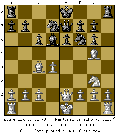 Last move : 0-1 2009 July 3 21:45:54 [Event "FICGS__CHESS__CLASS_D__000118"] [Site "FICGS"] [Date "2009.04.04"] [Round "1"] [White "Zaunercik,Ilmar"] [Black "Martinez Camacho,Victor Hugo"] [Result "0-1"] [WhiteElo "1743"] [BlackElo "1507"] 1.e4 c6 2.d4 d5 3.Nc3 dxe4 4.Nxe4 Bf5 5.Ng3 Bg6 6.Nf3 Nf6 7.Nh4 e6 8.Nxg6 hxg6 9.Bc4 Bd6 10.Bg5 Nbd7 11.Qe2 Qe7 0-1 This chess game has been lost on time (started : 2009.04.04 5:11:24) Caro-Kann : Classical variation Player Black won this chess game. Follow this game move after move (download)Chess is a terrible game. If you have no center, your opponent has a freer position. If you do have a center, then you really have something to worry about ! (Siegbert Tarrasch) Rubinstein ist ein Turmendspiel, welches die Götter vor tausenden von Jahren begannen. (Savielly Grigorievitsch Tartakower) El estómago es una parte esencial del maestro de Ajedrez. (Bent Larsen) A ce moment-là, je menaçais de comprendre la position ! (Clément L'Heureux) I fear not the man who has practiced 10,000 kicks once, but I fear the man who has practiced one kick 10,000 times. (Bruce Lee)