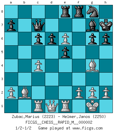Last move : 1/2-1/2 2006 June 27 23:56:34 [Event "FICGS__CHESS__RAPID_M__000002"] [Site "FICGS"] [Date "2006.04.18"] [Round "1"] [White "Zubac,Marius"] [Black "Helmer,Janos"] [Result "1/2-1/2"] [WhiteElo "2223"] [BlackElo "2250"] 1.d4 Nf6 2.c4 d6 3.Nf3 g6 4.Nc3 Bg7 5.e4 O-O 6.Be2 e5 7.O-O Nc6 8.d5 Ne7 9.b4 Nh5 10.Re1 f5 11.Ng5 Nf6 12.Bf3 c6 13.Bb2 h6 14.Ne6 Bxe6 15.dxe6 fxe4 16.Nxe4 Nxe4 17.Rxe4 Qc7 18.Rc1 Rae8 19.b5 Kh7 20.bxc6 bxc6 21.Re1 Ng8 22.Bg4 1/2-1/2 Old Indian defense Kingside Castling by player Black (move 5) Kingside Castling by player White (move 7) This chess game ended in a draw. Follow this game move after move (download)Chess holds its master in its own bonds, shackling the mind and brain so that the inner freedom of the very strongest must suffer. (Albert Einstein) Wie kann ich Remis annehmen? Ich weiß ja gar nicht, wie ich stehe! (Fritz Sämisch) Sin errores no puede haber brillantez. (Emanuel Lasker) Vous n'êtes pas toujours obligé de jouer le meilleur coup. Un coup doit être actif, entreprenant, correct et beau ! (David Bronstein) Plans are ideas that never come to fruition. (Daniel Parmet)