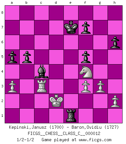 Last move : 1/2-1/2 2007 January 4 18:53:28 [Event "FICGS__CHESS__CLASS_C__000012"] [Site "FICGS"] [Date "2006.09.07"] [Round "1"] [White "Kepinski,Janusz"] [Black "Baron,Ovidiu"] [Result "1/2-1/2"] [WhiteElo "1700"] [BlackElo "1727"] 1.d4 Nf6 2.c4 e6 3.Nc3 Bb4 4.Qc2 O-O 5.a3 Bxc3+ 6.Qxc3 b6 7.Bg5 c5 8.e3 d6 9.Bd3 Nbd7 10.Ne2 Ba6 11.O-O Rc8 12.Rfd1 h6 13.Bh4 cxd4 14.Qxd4 Ne5 15.b3 Nxd3 16.Rxd3 d5 17.Qf4 Qc7 18.Bxf6 Qxf4 19.Nxf4 gxf6 20.e4 dxc4 21.bxc4 Rc5 22.Rd7 Ra8 23.f3 Kf8 24.Rad1 Bxc4 25.Rc1 Bb5 26.Rxc5 Bxd7 27.Rc7 Ke7 28.Nh5 Kd6 29.Rc2 f5 30.Rd2+ Ke7 31.exf5 exf5 32.Kf2 Rc8 33.Nf4 Be6 34.Ke3 Rc1 35.Rd4 Re1+ 36.Kf2 Ra1 37.Rd3 Bc4 38.Rc3 b5 39.Ke3 a5 40.g3 Re1+ 41.Kd2 1/2-1/2 Nimzo-Indian : Classical variation Kingside Castling by player Black (move 4) Kingside Castling by player White (move 11) This chess game ended in a draw. Follow this game move after move (download)Fischer is under obligation to nobody. (Joseph Platz) Schachspieler können ausgezeichnet Varianten am Schachbrett berechnen, aber nicht im realen Leben. Zu stark ist der Individualismus im Schach ausgeprägt, und für viele ist ein kleiner momentaner persönlicher Vorteil wichtiger als ein weit größerer Vorteil von morgen. (Anatoly Karpov) Alekhine es un poeta que crea un trabajo de arte de algo que raramente inspiraría a otra persona a mandar una tarjeta postal. (Max Euwe) Fischer est le meilleur joueur du monde et Karpov n'est qu'un joueur de bistrot. (Garry Kasparov, agé de 16 ans) Internet: Absolute communication, absolute isolation. (Paul Carvel)