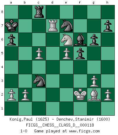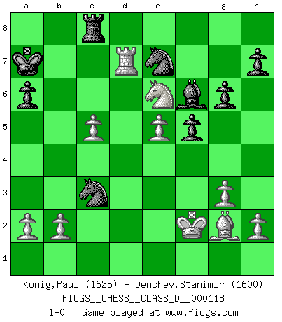 Last move : 1-0 2009 June 9 11:6:58 [Event "FICGS__CHESS__CLASS_D__000118"] [Site "FICGS"] [Date "2009.04.04"] [Round "1"] [White "Konig,Paul"] [Black "Denchev,Stanimir"] [Result "1-0"] [WhiteElo "1625"] [BlackElo "1600"] 1.c4 c5 2.Nf3 Nc6 3.g3 g6 4.Bg2 Bg7 5.Nc3 e6 6.O-O Nge7 7.d3 d5 8.Bf4 a6 9.Na4 b6 10.Qb3 Ra7 11.Qxb6 Rb7 12.Qxd8+ Kxd8 13.Rab1 dxc4 14.dxc4 e5 15.Bd2 Bf5 16.Nxc5 Bxb1 17.Nxb7+ Kc7 18.Rxb1 Kxb7 19.Ng5 f5 20.Ne6 Bf6 21.Bc3 Kb6 22.f4 Rc8 23.c5+ Ka7 24.Rd1 Nd4 25.fxe5 Nxe2+ 26.Kf2 Nxc3 27.Rd7+ 1-0 English : Symmetrical variation Kingside Castling by player White (move 6) Player White won this chess game. Follow this game move after move (download)Avoid the crowd. Do your own thinking independently. Be the Chess player, not the Chess piece. (Ralph Charell) Eine Person mit durchschnittlichem IQ kann etwa eine ELO von 2000 erreichen. (Jonathan Levitt) Siempre es mejor sacrificar los hombres de tu oponente. (Savielly Tartakower) Le plus grand jeu de l'esprit jamais inventé, plus vous l'apprenez, plus vous y prenez du plaisir. (Garry Kasparov) You cannot beat a roulette table unless you steal money from it. (Albert Einstein)