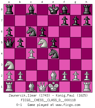 Last move : 0-1 2009 July 22 23:15:14 [Event "FICGS__CHESS__CLASS_D__000118"] [Site "FICGS"] [Date "2009.04.04"] [Round "1"] [White "Zaunercik,Ilmar"] [Black "Konig,Paul"] [Result "0-1"] [WhiteElo "1743"] [BlackElo "1625"] 1.e4 c5 2.Nf3 Nc6 3.d4 cxd4 4.Nxd4 Nf6 5.Nc3 e5 6.Ndb5 d6 7.Be2 a6 8.Na3 b5 9.Nd5 Nxe4 10.c4 Qa5+ 0-1 This chess game has been lost on time (started : 2009.04.04 5:11:24) Sicilian : Pelikan (Lasker/Sveshnikov) variation Player Black won this chess game. Follow this game move after move (download)Bobby Fischer's current state of mind is indeed a tragedy. One of the world's greatest Chess players - the pride and sorrow of American Chess. (Frank Brady) Man gibt nur Pakete auf. (Paul Keres) Durante una competencia de Ajedrez, un Maestro de Ajedrez deberá ser una combinación de presa de caza y un Monge. (Alexander Alekhine) Les ravages du H expliquent la différence de niveau entre Tal et Thal [Abergel]. All art requires courage. (Anne Tucker)