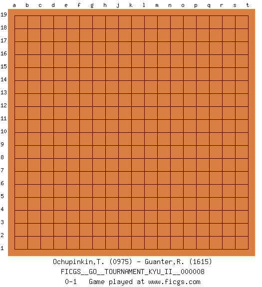 Last move : 0-1 2009 May 4 16:49:36 [Event "FICGS__GO__TOURNAMENT_KYU_II__000008"] [Site "FICGS"] [Date "2009.04.04"] [Round "1"] [Black "Ochupinkin,Teodor"] [White "Guanter,Renato"] [Result "0-1"] [Rating 1 "0975"] [Rating 2 "1615"] 0-1 This go game has been lost on time (started : 2009.04.04 7:38:54) Here are the names of the openings (joseki) played in the four corners : Player White won this Go (weiqi, baduk) game. Follow this game move after move (download)The enemy's vital point is your own. (Anonymous) The project of the man are lower than those of the sky. (Chinese proverb)