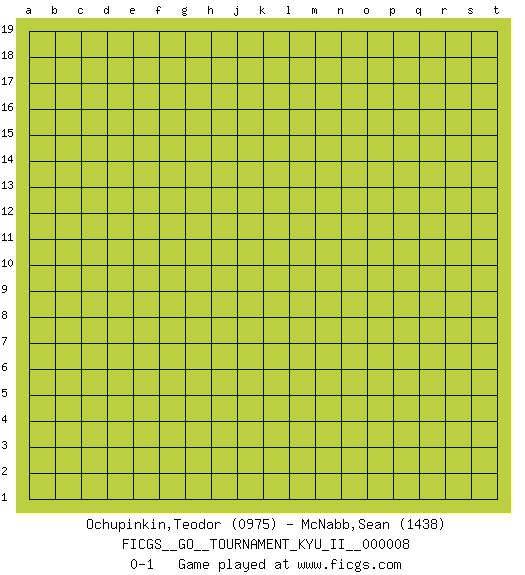 Last move : 0-1 2009 May 4 16:49:36 [Event "FICGS__GO__TOURNAMENT_KYU_II__000008"] [Site "FICGS"] [Date "2009.04.04"] [Round "1"] [Black "Ochupinkin,Teodor"] [White "McNabb,Sean"] [Result "0-1"] [Rating 1 "0975"] [Rating 2 "1438"] 0-1 This go game has been lost on time (started : 2009.04.04 7:38:54) Here are the names of the openings (joseki) played in the four corners : Player White won this Go (weiqi, baduk) game. Follow this game move after move (download)Don't count territory held by only one eye. (Anonymous) The intuitive mind is a sacred gift; the rational mind is a faithful servant. We have created a society that honors the servant but has forgotten the gift. (Albert Einstein)