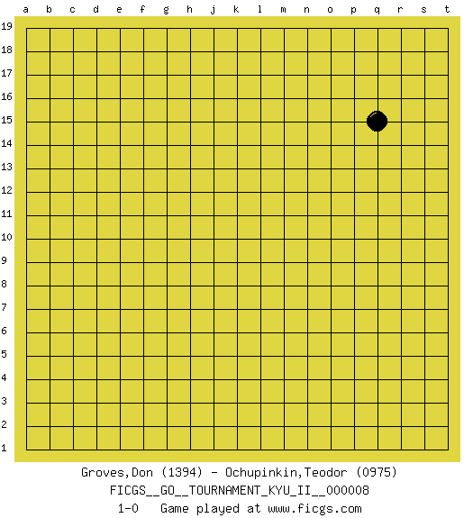 Last move : 1-0 2009 May 4 16:49:36 [Event "FICGS__GO__TOURNAMENT_KYU_II__000008"] [Site "FICGS"] [Date "2009.04.04"] [Round "1"] [Black "Groves,Don"] [White "Ochupinkin,Teodor"] [Result "1-0"] [Rating 1 "1394"] [Rating 2 "0975"] 1.q15 1-0 This go game has been lost on time (started : 2009.04.04 7:38:54) Here are the names of the openings (joseki) played in the four corners : Player Black won this Go (weiqi, baduk) game. Follow this game move after move (download)In the corner, five stones in a row on the third line are alive. (Anonymous) I have opinions of my own - strong opinions - but I don't always agree with them. (George Bush)