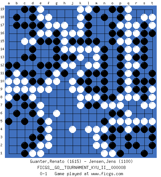 Last move : 0-1 2009 June 27 19:28:46 [Event "FICGS__GO__TOURNAMENT_KYU_II__000008"] [Site "FICGS"] [Date "2009.04.04"] [Round "1"] [Black "Guanter,Renato"] [White "Jensen,Jens"] [Result "0-1"] [Rating 1 "1615"] [Rating 2 "1100"] 1.d16 q16 2.d3 q5 3.o3 l4 4.q3 f3 5.c5 f17 6.d14 j16 7.o17 p17 8.o16 q14 9.l17 k18 10.l15 k14 11.f15 l14 12.m15 d17 13.c17 r3 14.r2 d9 15.c11 c10 16.d11 f10 17.c8 d8 18.d7 e7 19.d6 e6 20.e5 f5 21.e4 c18 22.b17 q8 23.r11 q11 24.r10 q10 25.r9 r12 26.s12 s11 27.s13 q9 28.s8 r8 29.s9 s7 30.r15 q15 31.s16 r17 32.r13 q12 33.s17 o18 34.n18 m2 35.r4 s3 36.s4 s2 37.q2 n4 38.n13 m14 39.n14 q18 40.o19 s18 41.p18 q13 42.n11 k11 43.f12 b9 44.b8 b11 45.b12 c12 46.a11 b10 47.c13 d12 48.e12 e11 49.d13 f4 50.b18 k9 51.n9 s5 52.t4 q4 53.s1 m12 54.n12 m10 55.n10 e18 56.c19 m8 57.g16 h17 58.d18 e2 59.d2 g11 60.m11 r5 61.t2 d1 62.c1 h14 63.n8 n7 64.o4 o5 65.n3 m3 66.n5 m4 67.o6 p5 68.m7 o7 69.l7 l8 70.m9 g17 71.e17 e16 72.d17 e19 73.l18 k17 74.d10 c9 75.k10 j10 76.l10 j9 77.g12 h12 78.e10 e9 79.f11 f9 80.h11 t5 81.t3 t8 82.s10 t9 83.t11 g10 84.h13 j12 85.j13 a8 86.a7 e1 87.e3 f2 88.c2 k13 89.g13 f16 90.e15 b7 91.c7 a6 92.b6 l19 93.a5 p8 94.a7 j14 95.k15 h15 96.g15 n2 97.o2 m13 98.m19 r14 99.s14 k19 100.d19 f18 101.l11 t17 102.t16 t18 103.p14 p15 104.o15 k7 105.t10 t7 106.p6 q6 107.p4 o1 108.p1 n1 109.p13 l12 110.g14 q19 111.p19 g6 112.o8 p7 113.p12 a9 114.p11 r16 115.s15 h16 116.p10 k16 117.l16 j4 118.l9 k8 119.p16 q17 120.p9 a10 121.a12 c15 122.j15 d15 123.pass pass 124.pass pass 0-1 Here are the names of the openings (joseki) played in the four corners : Corner q4 : q5 o3 Takamoku (Gomok, Gaomu`) 5-4 Point. The takamoku (high) point (5-4). With its emphasis on influence, the 5-4 point complements the 4-4 (hoshi) point in creating an influence-oriented fuseki. Corner d4 : d3 f3 Komoku (Somok, Xiao~mu`) 3-4 Point. The komoku (3-4) point is the traditional corner enclosure move.. Corner d16 : d16 f17 Hoshi (Hwajeom, Seongjeom, Xingwei`) 4-4 Point. The star or hoshi (4-4) point, emphasizing influence at the potential expense of territory. Ikken Kakari (Hankan Keolch'im, Yi Gua`jiao~, 1-Space Low Approach). White 2 is the standard approach move to the 4-4. Corner q16 : q16 o17 Hoshi (Hwajeom, Seongjeom, Xingwei`) 4-4 Point. The star or hoshi (4-4) point, emphasizing influence at the potential expense of territory. Ikken Kakari (Hankan Keolch'im, Yi Gua`jiao~, 1-Space Low Approach). Black 2 is the standard approach move to the 4-4. Player White won this Go (weiqi, baduk) game. Follow this game move after move (download)Atari, atari is vulgar play. (Anonymous) Statistics can be made to prove anything - even the truth. (Author unknown)