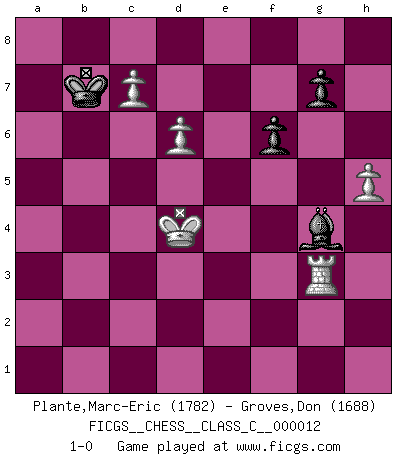 Last move : 1-0 2006 October 15 6:1:13 [Event "FICGS__CHESS__CLASS_C__000012"] [Site "FICGS"] [Date "2006.09.07"] [Round "1"] [White "Plante,Marc-Eric"] [Black "Groves,Don"] [Result "1-0"] [WhiteElo "1782"] [BlackElo "1688"] 1.e4 c6 2.d4 d5 3.Nc3 Nf6 4.e5 Ne4 5.Nxe4 dxe4 6.Ne2 Bg4 7.c3 Nd7 8.Qc2 e6 9.Qxe4 Bf5 10.Qf3 Qa5 11.Ng3 Bg6 12.Be2 h5 13.h4 Be7 14.Ne4 O-O-O 15.b4 Qd5 16.Nd2 Nb6 17.a4 a5 18.bxa5 Qxa5 19.Bc4 Nxc4 20.Nxc4 Qa6 21.Qe2 c5 22.Be3 Kb8 23.a5 cxd4 24.Bxd4 Rd5 25.f3 Rhd8 26.Kf2 Bf5 27.Ra2 Bc5 28.Rc1 Rc8 29.Rd2 Rc7 30.Bxc5 Rdxc5 31.Nd6 Qxe2+ 32.Rxe2 Rxa5 33.c4 Bd3 34.Rd2 Bg6 35.Re1 Rd7 36.g4 Rc7 37.gxh5 Bxh5 38.Rb2 Rd7 39.f4 Ra3 40.Reb1 Rf3+ 41.Kg2 Rxf4 42.c5 Rg4+ 43.Kh3 Rd4 44.Rxb7+ Rxb7 45.Rxb7+ Ka8 46.Rb3 Rd2 47.Rc3 Be2 48.c6 Ba6 49.c7 Ka7 50.Rc6 Rxd6 51.exd6 Bc8 52.h5 e5 53.Kg2 Kb7 54.Rc3 e4 55.Kg3 Be6 56.Kf4 Bc8 57.Kxe4 Bd7 58.Ke5 Bg4 59.Rg3 f6+ 60.Kd4 1-0 Caro-Kann defense Queenside Castling by player Black (move 14) 10 pieces endgame at move 51 : White KRPPP , Black KBPPP WHITE : King + 1 Rook 3 Pawns BLACK : King + 1 Bishop 3 Pawns 9 pieces endgame at move 57 : White KRPPP , Black KBPP WHITE : King + 1 Rook 3 Pawns BLACK : King + 1 Bishop 2 Pawns Player White won this chess game. Follow this game move after move (download)A bad day of Chess is better than any good day at work. (Anonymous) Ihnen, Herr Lasker, habe ich nur drei Worte zu sagen: Schach und matt. (Siegbert Tarrasch) El Ajedrez es un regaderazo frío para la mente. (Sir John Simon) J'apprécie les joueurs d'est-indienne, c'est grâce à eux que je nourris ma famille depuis tant d'années. (Petrosian) No man has ever achieved immortality in his own life time. (Unknown)