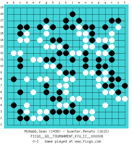 Last move : 0-1 2009 October 9 8:42:14 [Event "FICGS__GO__TOURNAMENT_KYU_II__000008"] [Site "FICGS"] [Date "2009.04.04"] [Round "1"] [Black "McNabb,Sean"] [White "Guanter,Renato"] [Result "0-1"] [Rating 1 "1438"] [Rating 2 "1615"] 1.q16 q4 2.d16 d4 3.k16 r14 4.r12 p14 5.o16 s16 6.r17 p12 7.r9 r6 8.q13 q14 9.c6 f3 10.c11 e6 11.b4 d8 12.c3 d3 13.d2 e2 14.c2 c14 15.c15 d14 16.f16 f14 17.l3 e11 18.b8 n3 19.h3 m5 20.h5 k4 21.l4 l5 22.k3 j4 23.j3 k6 24.j6 k7 25.g7 f8 26.n2 o2 27.m2 o3 28.p9 p7 29.q7 q6 30.r7 s7 31.s8 q8 32.r8 q9 33.q10 p8 34.p11 q12 35.r11 r13 36.n10 o9 37.p10 n15 38.n16 l17 39.k17 m16 40.o15 n14 41.o14 o13 42.l16 g16 43.g17 d15 44.c16 c12 45.c10 b12 46.n12 n13 47.m17 m15 48.l18 m12 49.n11 n9 50.l11 j7 51.g6 g8 52.g2 f2 53.l9 l8 54.s6 s5 55.t7 t5 56.h16 g15 57.j14 h13 58.h14 g13 59.j10 h10 60.h11 g10 61.s17 r15 62.j12 j13 63.g11 f11 64.k13 l12 65.k12 j9 66.k9 k8 67.j5 g3 0-1 This go game has been lost on time (started : 2009.04.04 7:38:54) Here are the names of the openings (joseki) played in the four corners : Corner q16 : q16 r14 Hoshi (Hwajeom, Seongjeom, Xingwei`) 4-4 Point. The star or hoshi (4-4) point, emphasizing influence at the potential expense of territory. Ikken Kakari (Hankan Keolch'im, Yi Gua`jiao~, 1-Space Low Approach). White 2 is the standard approach move to the 4-4. Corner q4 : q4 r9 Hoshi (Hwajeom, Seongjeom, Xingwei`) 4-4 Point. The star or hoshi (4-4) point, emphasizing influence at the potential expense of territory. Corner d4 : d4 c6 Hoshi (Hwajeom, Seongjeom, Xingwei`) 4-4 Point. The star or hoshi (4-4) point, emphasizing influence at the potential expense of territory. Ikken Kakari (Hankan Keolch'im, Yi Gua`jiao~, 1-Space Low Approach). Black 2 is the standard approach move to the 4-4. Player White won this Go (weiqi, baduk) game. Follow this game move after move (download)Everything would seem to be possible in Go. Like pulling a rabbit, by a magical move, out of a hat. (Pierre Audouard) As a goal marker shodan is important. As a destination it is a poor place to stop. (Thomas Tamayo)