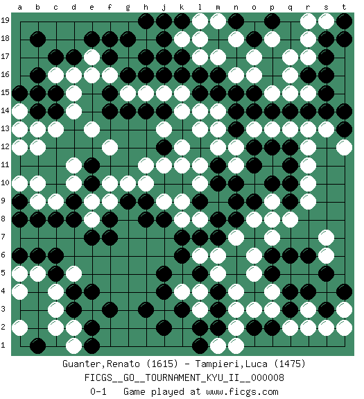 Last move : 0-1 2009 May 17 20:54:39 [Event "FICGS__GO__TOURNAMENT_KYU_II__000008"] [Site "FICGS"] [Date "2009.04.04"] [Round "1"] [Black "Guanter,Renato"] [White "Tampieri,Luca"] [Result "0-1"] [Rating 1 "1615"] [Rating 2 "1475"] 1.q4 d16 2.d4 q16 3.r14 r12 4.p14 o16 5.s16 r17 6.p12 r9 7.r6 p9 8.q10 r10 9.q9 q8 10.p10 p8 11.n15 q13 12.q14 p13 13.o12 o13 14.o15 n16 15.m16 m17 16.l16 l17 17.k16 m12 18.n10 m14 19.n13 n12 20.n14 m13 21.m15 l10 22.o9 o8 23.n8 o6 24.o4 m9 25.n9 n7 26.m8 l8 27.m7 m6 28.l7 k8 29.m10 l11 30.l9 k9 31.k6 l6 32.k7 l4 33.h8 h10 34.j4 j3 35.h3 k4 36.j5 d10 37.d8 f9 38.f7 c13 39.k17 n18 40.s17 r18 41.s18 g17 42.c17 c16 43.d17 e16 44.f18 e17 45.e18 h18 46.b16 b15 47.b18 b9 48.b8 c9 49.c8 r3 50.r4 p3 51.q3 p4 52.p2 o3 53.o2 n3 54.a9 a10 55.a8 b10 56.h14 j15 57.h16 h15 58.g16 g15 59.f17 k18 60.h17 c3 61.d3 c4 62.c5 d2 63.e2 b5 64.b6 d5 65.c6 e3 66.e4 c2 67.f3 a2 68.b1 a4 69.j18 j19 70.j17 l18 71.g18 s7 72.f15 f16 73.f14 k14 74.j14 k15 75.k13 l14 76.l12 k12 77.j12 k11 78.c15 d15 79.c14 d14 80.b14 b13 81.a15 e13 82.k3 l3 83.j2 s6 84.p5 o5 85.r16 q17 86.e10 e9 87.d9 f10 88.e11 d11 89.h9 h11 90.q12 r13 91.a13 b12 92.m2 n2 93.m3 n4 94.l2 n1 95.m4 r2 96.s3 s2 97.s5 q2 98.p6 p7 99.q6 t3 100.t4 t2 101.l5 m5 102.f8 f12 103.h19 s13 104.s14 r11 105.q11 s19 106.t18 j9 107.j8 j11 108.m11 e8 109.e7 m1 110.l1 q15 111.k19 l19 112.j19 r15 113.s15 p15 114.o14 n11 115.o11 a12 116.t19 r19 117.o18 o17 118.a6 a5 119.g9 g10 120.t13 t12 121.t14 d1 122.e1 a14 123.b15 a13 124.n19 p18 125.p19 m19 126.j16 l13 127.l15 m9 128.g14 j13 129.l9 pass 130.pass pass 0-1 Here are the names of the openings (joseki) played in the four corners : Corner q16 : q16 r14 Hoshi (Hwajeom, Seongjeom, Xingwei`) 4-4 Point. The star or hoshi (4-4) point, emphasizing influence at the potential expense of territory. Ikken Kakari (Hankan Keolch'im, Yi Gua`jiao~, 1-Space Low Approach). Black 2 is the standard approach move to the 4-4. Corner q4 : q4 r9 Hoshi (Hwajeom, Seongjeom, Xingwei`) 4-4 Point. The star or hoshi (4-4) point, emphasizing influence at the potential expense of territory. Player White won this Go (weiqi, baduk) game. Follow this game move after move (download)Those who are good at winning, don't usually fight. (Zhang) He who fights with monsters should be careful lest he thereby become a monster. (Friedrich Nietzsche, Beyond Good and Evil)