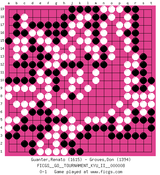 Last move : 0-1 2009 September 18 18:3:33 [Event "FICGS__GO__TOURNAMENT_KYU_II__000008"] [Site "FICGS"] [Date "2009.04.04"] [Round "1"] [Black "Guanter,Renato"] [White "Groves,Don"] [Result "0-1"] [Rating 1 "1615"] [Rating 2 "1394"] 1.d4 c17 2.q4 q15 3.r17 p17 4.q16 p16 5.r15 q14 6.r14 q12 7.h17 h15 8.l17 l15 9.e17 g16 10.g17 k4 11.c10 q6 12.o3 d7 13.c16 d16 14.d17 c15 15.b16 g4 16.d15 e16 17.f16 e15 18.d14 f15 19.f17 c3 20.c4 d3 21.e4 c14 22.c13 d13 23.e14 b13 24.c12 r4 25.r3 s4 26.s3 f14 27.e13 g12 28.f13 g13 29.f11 f12 30.e12 b5 31.b4 r10 32.s12 n5 33.g11 e11 34.d12 e10 35.g9 f7 36.e7 e8 37.e6 f8 38.d8 d9 39.c8 c9 40.b8 b9 41.b10 f10 42.g10 j10 43.j12 h11 44.h12 g14 45.j15 j14 46.k9 j9 47.j8 h8 48.e3 k11 49.h16 j16 50.g15 k15 51.l3 g2 52.f2 f3 53.r5 e2 54.d2 f1 55.c2 j17 56.j18 k18 57.h18 b15 58.a15 b14 59.b17 c18 60.b18 a9 61.b12 r8 62.o5 o6 63.n4 k17 64.k3 m5 65.m4 l5 66.r6 q5 67.q7 p4 68.q3 r7 69.s5 s6 70.t4 j3 71.j2 k8 72.o4 p7 73.p6 p5 74.p3 q8 75.k19 l18 76.l19 c6 77.m18 q18 78.r18 b7 79.m16 n15 80.m15 m14 81.n14 o14 82.n13 m13 83.n12 n16 84.m12 m10 85.l13 l14 86.h14 h13 87.h3 j4 88.h2 h4 89.r11 q11 90.f4 g3 91.f6 g6 92.s10 l16 93.m17 r13 94.s13 n17 95.n18 o18 96.m19 r12 97.s11 q10 98.k12 j13 99.g5 h6 100.h5 j5 101.f5 k10 102.s9 s8 103.t6 s7 104.r9 q9 105.q19 p19 106.r19 q17 107.r16 a4 108.a3 a5 109.b3 m11 110.a10 t7 111.l4 h1 112.k1 o13 113.j1 g1 114.d1 e1 115.d6 c7 116.c5 a8 117.d11 t9 118.t10 t8 119.t5 o19 120.d10 n19 121.j19 f9 122.g16 l9 123.pass pass 0-1 Here are the names of the openings (joseki) played in the four corners : Corner q16 : q15 r17 Takamoku (Gomok, Gaomu`) 5-4 Point. The takamoku (high) point (5-4). With its emphasis on influence, the 5-4 point complements the 4-4 (hoshi) point in creating an influence-oriented fuseki. San-san. Black plays the 3-3 when White has a stone at top such as marked. Corner d16 : c17 h17 San-San (Sam-Sam, San-San) 3-3 Point. The San-San (3-3) point, emphasizing territory at the expense of influence. Corner q4 : q4 q6 Hoshi (Hwajeom, Seongjeom, Xingwei`) 4-4 Point. The star or hoshi (4-4) point, emphasizing influence at the potential expense of territory. Ikken Takagakari (Hankan Nop'dakeolch'im, Yi Gaojia, 1-Space High Approach). Black typically responds at 6-4 or 3-10. Black 4-10 is played when Black finds play on the right side advantageous. Black 4-8 or 3-8 may be played when Black has support at top. Corner d4 : d4 d7 Hoshi (Hwajeom, Seongjeom, Xingwei`) 4-4 Point. The star or hoshi (4-4) point, emphasizing influence at the potential expense of territory. Nikken Takagakari (Dukan Nop'dakeolch'im, E`r Gaojia, 2-Space High Approach). White 2 is a light approach move. Rarely played in even games, White 2 is typically employed in handicap games. Black continues with 6-4 or 3-10. In Korean Sunjang Baduk Black has a stone on 8-4. Player White won this Go (weiqi, baduk) game. Follow this game move after move (download)Extend one hand from the cutting points. (Anonymous) Men should grow up. - Yeah. And dogs should stop licking themselves. It's not gonna happen. (Gregory House to Dr. Cameron, House M.D.)