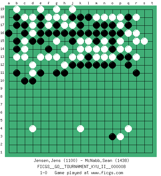 Last move : 1-0 2009 April 20 11:37:41 [Event "FICGS__GO__TOURNAMENT_KYU_II__000008"] [Site "FICGS"] [Date "2009.04.04"] [Round "1"] [Black "Jensen,Jens"] [White "McNabb,Sean"] [Result "1-0"] [Rating 1 "1100"] [Rating 2 "1438"] 1.q17 d4 2.d15 q4 3.q15 r13 4.r11 s15 5.q12 r16 6.q13 q16 7.p16 p17 8.o17 p18 9.q18 o18 10.n17 n18 11.c10 d17 12.f16 c15 13.c16 d16 14.c17 c18 15.b18 d18 16.b15 c14 17.b14 c13 18.e15 b19 19.b17 f18 20.m17 m18 21.k17 h17 22.h16 j17 23.l18 r18 24.j16 b13 25.a16 e13 26.e11 g13 27.h11 j13 28.k12 k13 29.l13 k15 30.k16 l14 31.j18 h18 32.h19 g19 33.g17 j19 34.o15 m13 35.l12 n14 36.m15 n15 37.k18 f17 38.e16 e19 39.e17 p14 40.o14 p15 41.o16 q14 42.p13 r15 43.e18 o13 44.o12 n13 45.m12 g15 46.g16 g18 47.f14 f13 48.b11 k4 49.o3 p3 50.n12 m16 51.l16 l15 52.n16 m14 53.g11 d11 54.d10 d12 55.j15 k14 56.h13 h12 57.j12 h14 58.m16 1-0 Here are the names of the openings (joseki) played in the four corners : Corner d16 : d15 d17 Takamoku (Gomok, Gaomu`) 5-4 Point. The takamoku (high) point (5-4). With its emphasis on influence, the 5-4 point complements the 4-4 (hoshi) point in creating an influence-oriented fuseki. Komoku. Black responds with 3-3, 3-5, 4-6, 4-7, 3-6, 3-7. Corner q4 : q4 o3 Hoshi (Hwajeom, Seongjeom, Xingwei`) 4-4 Point. The star or hoshi (4-4) point, emphasizing influence at the potential expense of territory. Ikken Kakari (Hankan Keolch'im, Yi Gua`jiao~, 1-Space Low Approach). Black 2 is the standard approach move to the 4-4. Player Black won this Go (weiqi, baduk) game. Follow this game move after move (download)The nature of a game comes from what is played, but it's the sensitivity to the possible and the impossible that gives it value. (Pierre Audouard) No man has ever achieved immortality in his own life time. (Unknown)