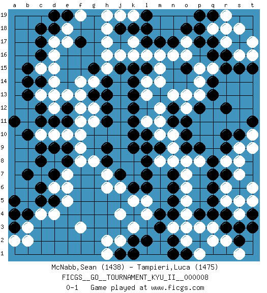 Last move : 0-1 2009 July 9 10:26:6 [Event "FICGS__GO__TOURNAMENT_KYU_II__000008"] [Site "FICGS"] [Date "2009.04.04"] [Round "1"] [Black "McNabb,Sean"] [White "Tampieri,Luca"] [Result "0-1"] [Rating 1 "1438"] [Rating 2 "1475"] 1.q16 d4 2.q4 d16 3.f17 h17 4.c17 d17 5.c16 d15 6.d18 e18 7.c18 e17 8.b14 c15 9.b15 o3 10.m3 o5 11.q6 q2 12.r3 k3 13.c6 d6 14.d7 e6 15.c5 c4 16.b4 b3 17.a5 e7 18.c8 r8 19.r7 p8 20.r12 r5 21.q5 s7 22.s6 r6 23.q7 s5 24.q8 s9 25.r9 s8 26.r10 l5 27.m17 h15 28.n7 f3 29.n4 o4 30.n5 o6 31.n6 o7 32.p9 n8 33.l7 m8 34.l6 k5 35.l8 m10 36.j7 h6 37.k10 m12 38.k12 m14 39.k2 j2 40.l2 j4 41.k14 o13 42.q14 r17 43.q17 q18 44.p18 s18 45.q19 r18 46.r16 s16 47.s15 t17 48.t15 t16 49.n11 m11 50.o9 o8 51.o15 r2 52.s2 q3 53.r4 l13 54.k13 l14 55.n12 l16 56.l17 k16 57.e8 d13 58.c12 d12 59.c11 n10 60.o10 g12 61.j15 j16 62.h14 g14 63.g15 h16 64.g13 f14 65.h13 f13 66.h12 g11 67.h9 n13 68.p12 p13 69.q13 f8 70.e9 f9 71.h11 h7 72.h8 d10 73.c9 c10 74.b10 c13 75.b13 s4 76.s3 n16 77.n17 o16 78.j18 h18 79.k18 p15 80.a3 b2 81.j1 h1 82.k1 h2 83.t4 t6 84.e19 f19 85.d19 h19 86.d11 e10 87.e11 f11 88.d9 f10 89.e12 e13 90.c14 d14 91.s10 a2 92.a4 o17 93.o18 j19 94.p17 k19 95.l19 o12 96.o11 p14 97.n2 o2 98.n1 n3 99.m4 q15 100.r15 l9 101.k9 m16 102.t3 t5 103.k15 j6 104.k6 s1 105.b7 g8 106.o1 p1 107.l15 m15 108.l10 k17 109.l18 l11 110.k11 l4 111.m9 n9 112.l9 f12 113.a11 r19 114.p19 t10 115.t11 t9 116.d5 e5 117.p4 p3 0-1 Here are the names of the openings (joseki) played in the four corners : Corner d16 : d16 f17 Hoshi (Hwajeom, Seongjeom, Xingwei`) 4-4 Point. The star or hoshi (4-4) point, emphasizing influence at the potential expense of territory. Ikken Kakari (Hankan Keolch'im, Yi Gua`jiao~, 1-Space Low Approach). Black 2 is the standard approach move to the 4-4. Corner q4 : q4 o3 Hoshi (Hwajeom, Seongjeom, Xingwei`) 4-4 Point. The star or hoshi (4-4) point, emphasizing influence at the potential expense of territory. Ikken Kakari (Hankan Keolch'im, Yi Gua`jiao~, 1-Space Low Approach). White 2 is the standard approach move to the 4-4. Corner d4 : d4 c6 Hoshi (Hwajeom, Seongjeom, Xingwei`) 4-4 Point. The star or hoshi (4-4) point, emphasizing influence at the potential expense of territory. Ikken Kakari (Hankan Keolch'im, Yi Gua`jiao~, 1-Space Low Approach). Black 2 is the standard approach move to the 4-4. Player White won this Go (weiqi, baduk) game. Follow this game move after move (download)Don't make compact groups of stones. (Anonymous) In fact if nothing is done against this teddy bear, hereby I announce that I would quit chess, rapid chess, blitz chess, postal chess, email chess, server chess and correspondence chess I will then switch to a table game where teddy bears aren't going to be seen for a while, like Poker, or Roulette, all 18+ games. (Elmer Valderrama)