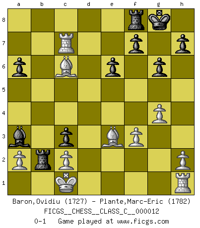 Last move : 0-1 2006 September 28 9:50:24 [Event "FICGS__CHESS__CLASS_C__000012"] [Site "FICGS"] [Date "2006.09.07"] [Round "1"] [White "Baron,Ovidiu"] [Black "Plante,Marc-Eric"] [Result "0-1"] [WhiteElo "1727"] [BlackElo "1782"] 1.e4 c5 2.Nf3 d6 3.d4 cxd4 4.Nxd4 Nf6 5.Nc3 a6 6.Be3 Nc6 7.f3 e6 8.Qd2 Be7 9.g4 O-O 10.O-O-O Nxd4 11.Qxd4 b5 12.e5 dxe5 13.Qxe5 Nd7 14.Qe4 Rb8 15.Bd3 g6 16.Qf4 Bb7 17.Be4 b4 18.Bxb7 bxc3 19.Bc6 Rxb2 20.Rxd7 Qc8 21.Qc7 Qxc7 22.Rxc7 Ba3 0-1 Sicilian : Najdorf, Byrne (English) attack Kingside Castling by player Black (move 9) Queenside Castling by player White (move 10) Player Black won this chess game. Follow this game move after move (download)Chess teaches you to control the initial excitement you feel when you see something that looks good and it trains you to think objectively when you're in trouble. (Stanley Kubrick) Der Freibauer hat für mich eine Seele, genau wie der Mensch, Wünsche, die unerkannt in ihm schlummern, und Befürchtungen, von deren Existenz er selbst kaum ahnt. (Aaron Nimzowitsch) El Ajedrez es parte de la cultura, y si una cultura esta en decadencia, entonces también el Ajedrez declinará. (Mikhail Botvinnik) Une platitude souvent récitée à propos des Echecs est qu'une des choses les plus difficiles à réaliser est de gagner une position gagnante. Cela ne manque pas de sens mais, pour ma part, j'ai toujours trouvé plus difficile de gagner une position perdante. (Tim Krabbe) If you work for a living, why do you kill yourself working ? (Tuco to a chicken in The Good, The Bad and The Ugly)